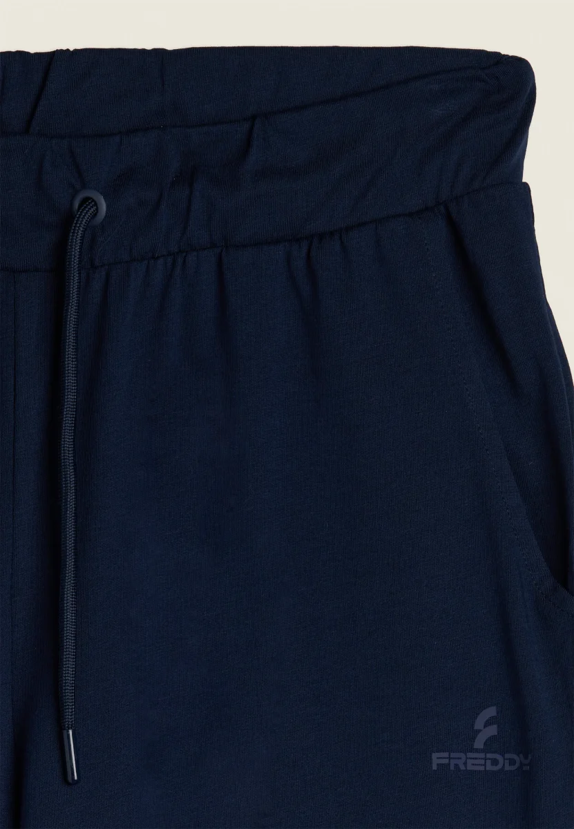 Un mix di comfort e funzionalità per questi pantaloni sportivi in jersey di cotone elasticizzato. La vita regular con coulisse in tono colore offre un fit regolabile, mentre la gamba regular e il fondo dritto garantiscono libertà di movimento. Tasche anteriori interne per la massima praticità. Piccolo logo FREDDY sul fianco sinistro.