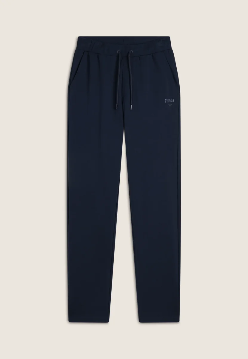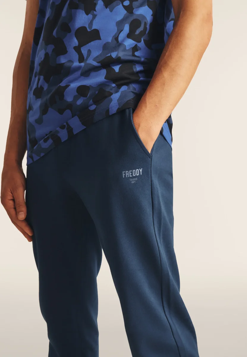 Pantaloni sportivi in french terry di cotone, con vita in costina e coulisse in tono colore. Gamba dritta e tasche anteriori alla francese. Piccola stampa FREDDY TRAINING DEPT sul fianco sinistro per un look pratico e contemporaneo.