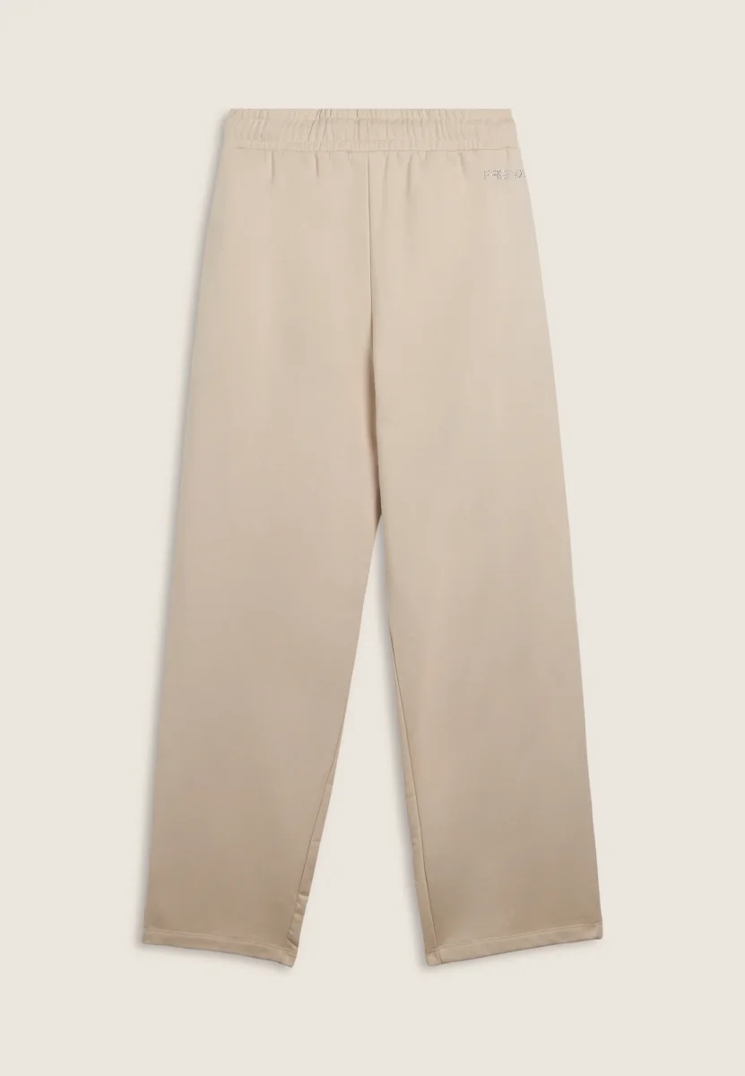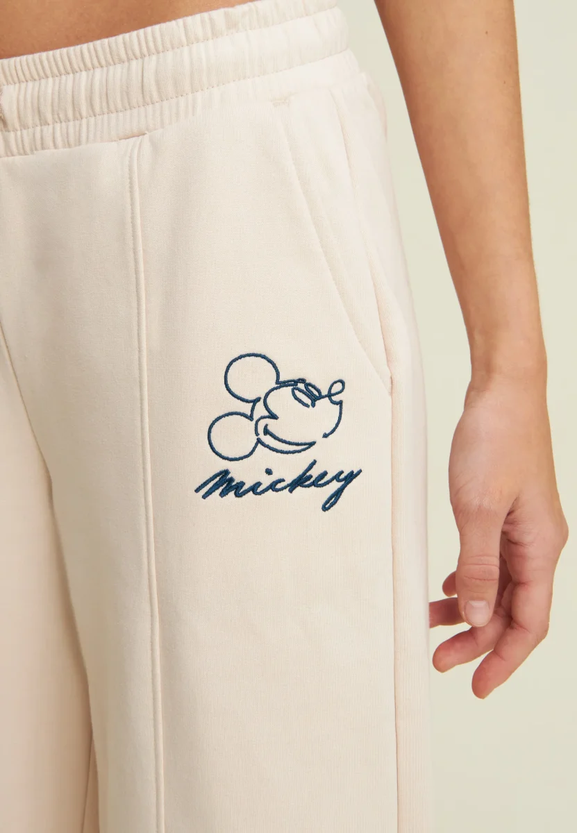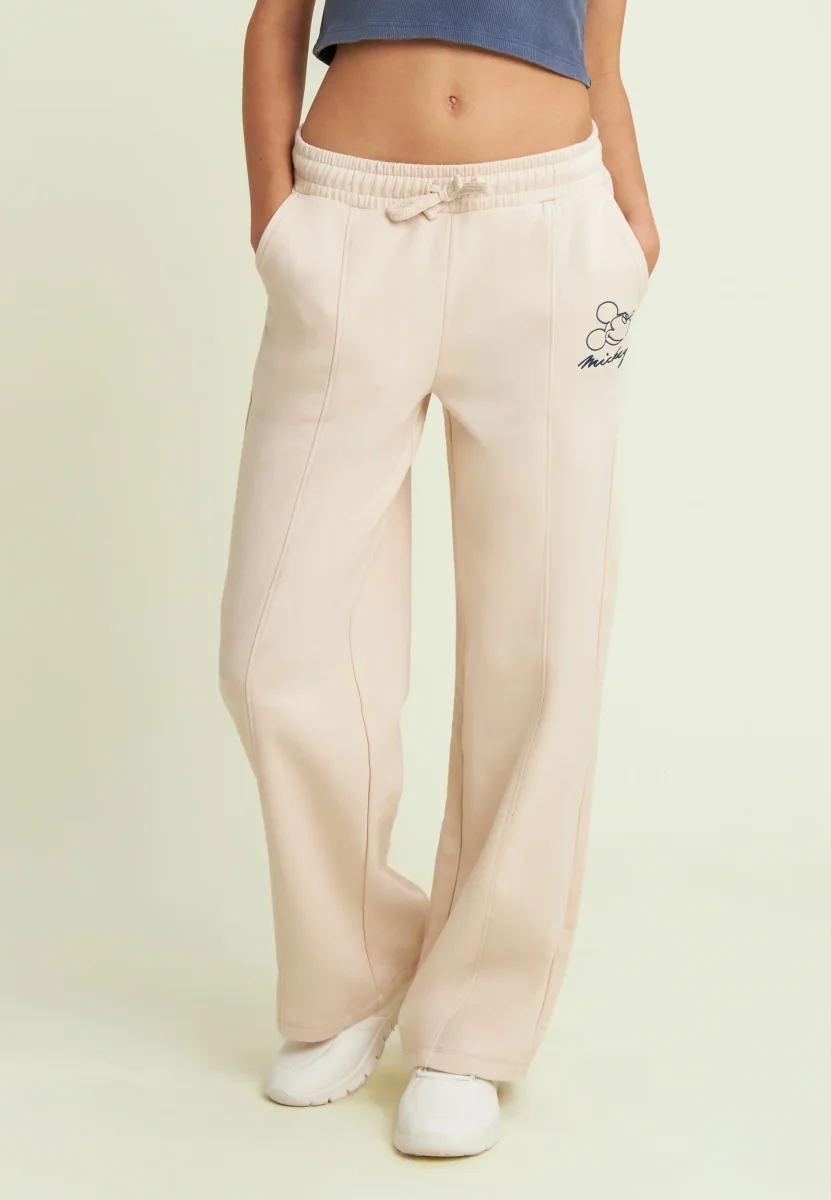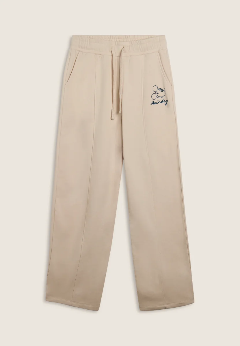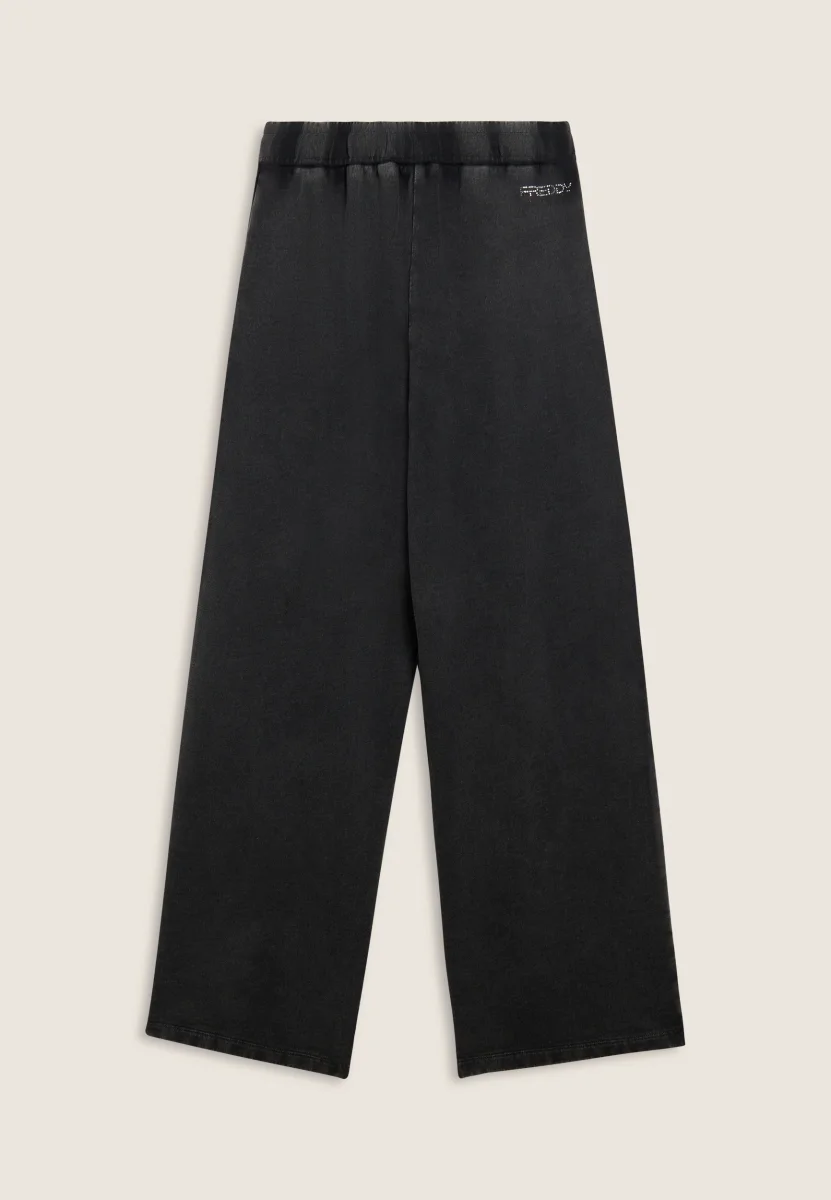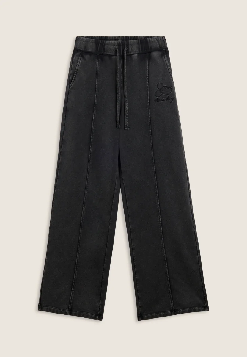 Pantaloni wide leg da donna in French terry con trattamento acid wash effect, per un effetto lavato naturale che rende ogni capo unico. La vestibilità è comfort, con vita regular elasticizzata e coulisse. La gamba ampia è valorizzata da una cucitura centrale. Ricamo di Mickey Mouse sul fianco, tasche alla francese e logo FREDDY in strass sul fianco posteriore completano il look.