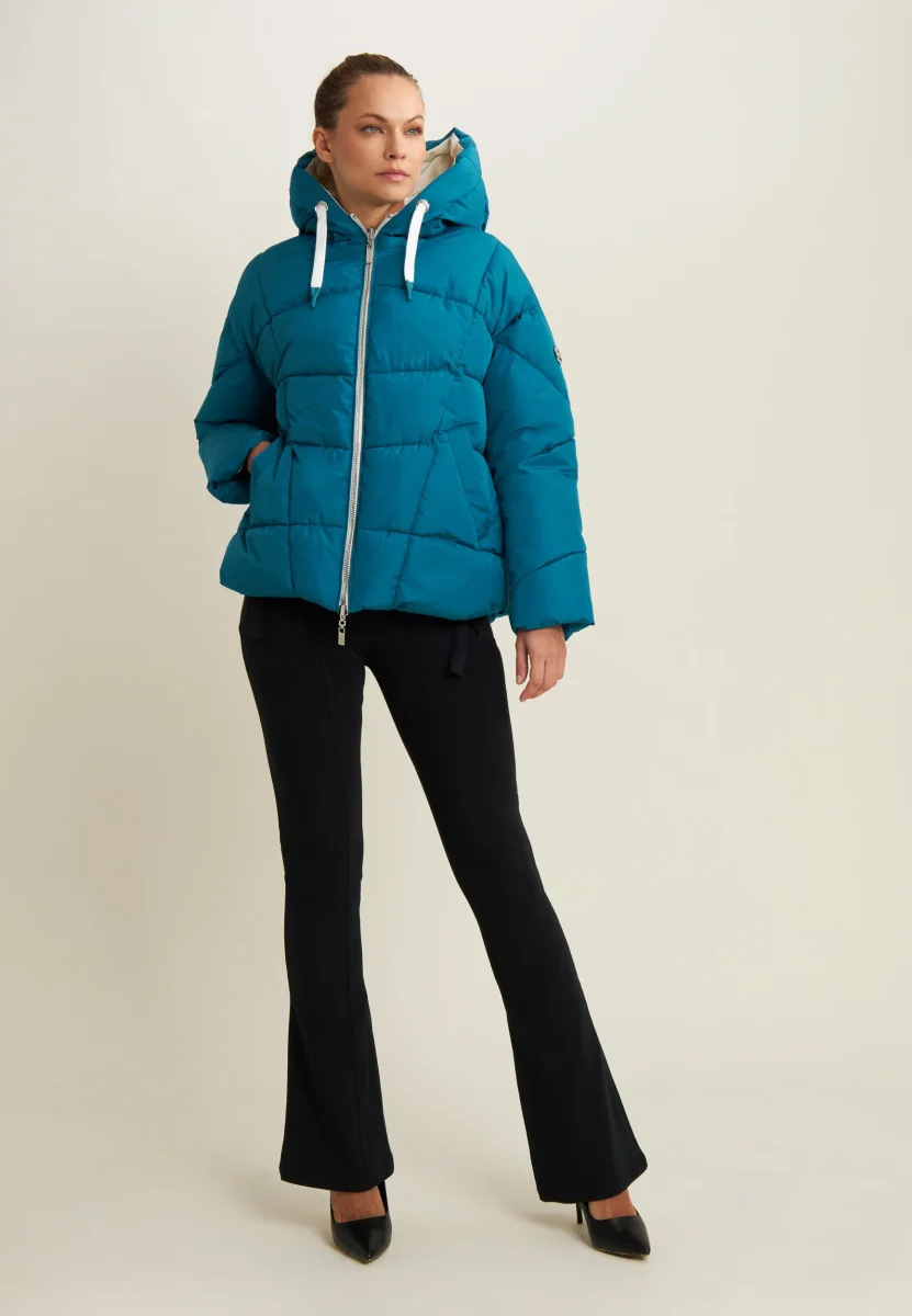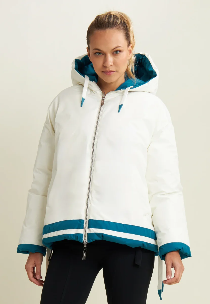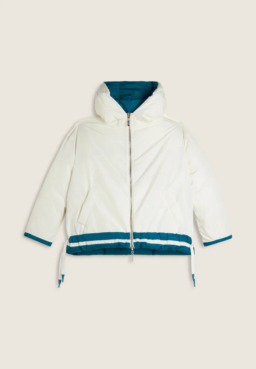 Piumino double-face dalla vestibilità comfort e lunghezza ai fianchi, ideale per creare look diversi. Trapuntato a bande orizzontali su un lato e con dettagli a contrasto sull’altro, è imbottito in fake-down animal-friendly per mantenere calore e leggerezza anche con umidità. Chiusura full zip, cappuccio regolabile con coulisse e fondo con coulisse per adattare il fit. Tasche frontali con bottone a pressione nascosto e logo con strass completano il design versatile.
