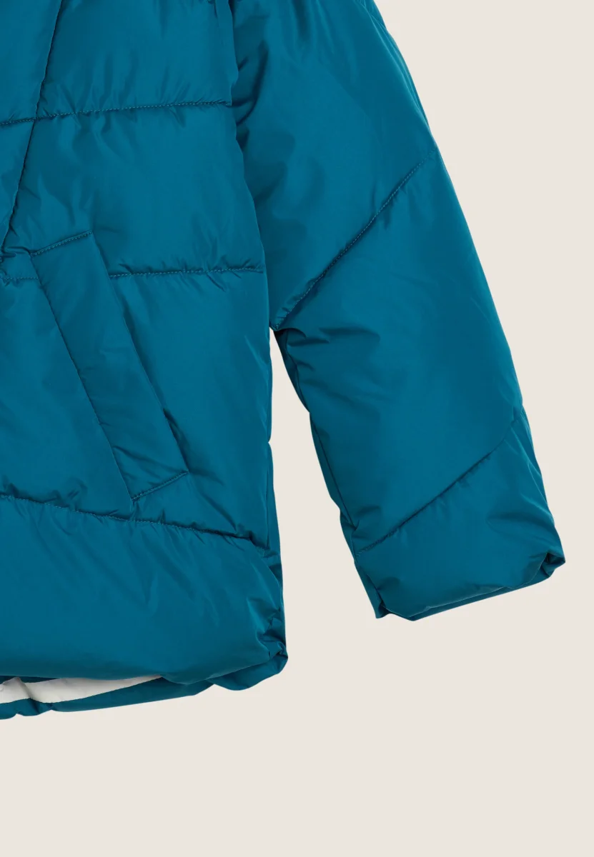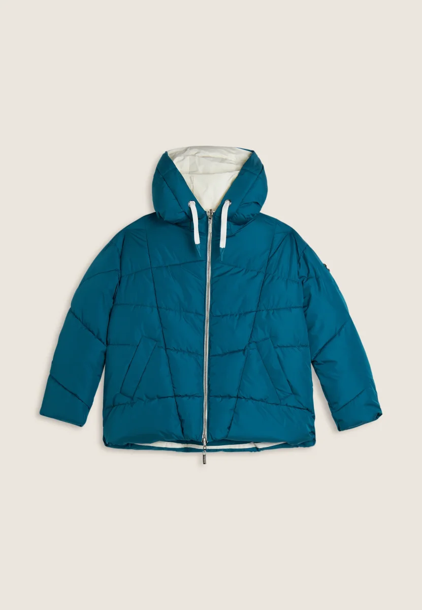 Piumino double-face dalla vestibilità comfort e lunghezza ai fianchi, ideale per creare look diversi. Trapuntato a bande orizzontali su un lato e con dettagli a contrasto sull’altro, è imbottito in fake-down animal-friendly per mantenere calore e leggerezza anche con umidità. Chiusura full zip, cappuccio regolabile con coulisse e fondo con coulisse per adattare il fit. […]