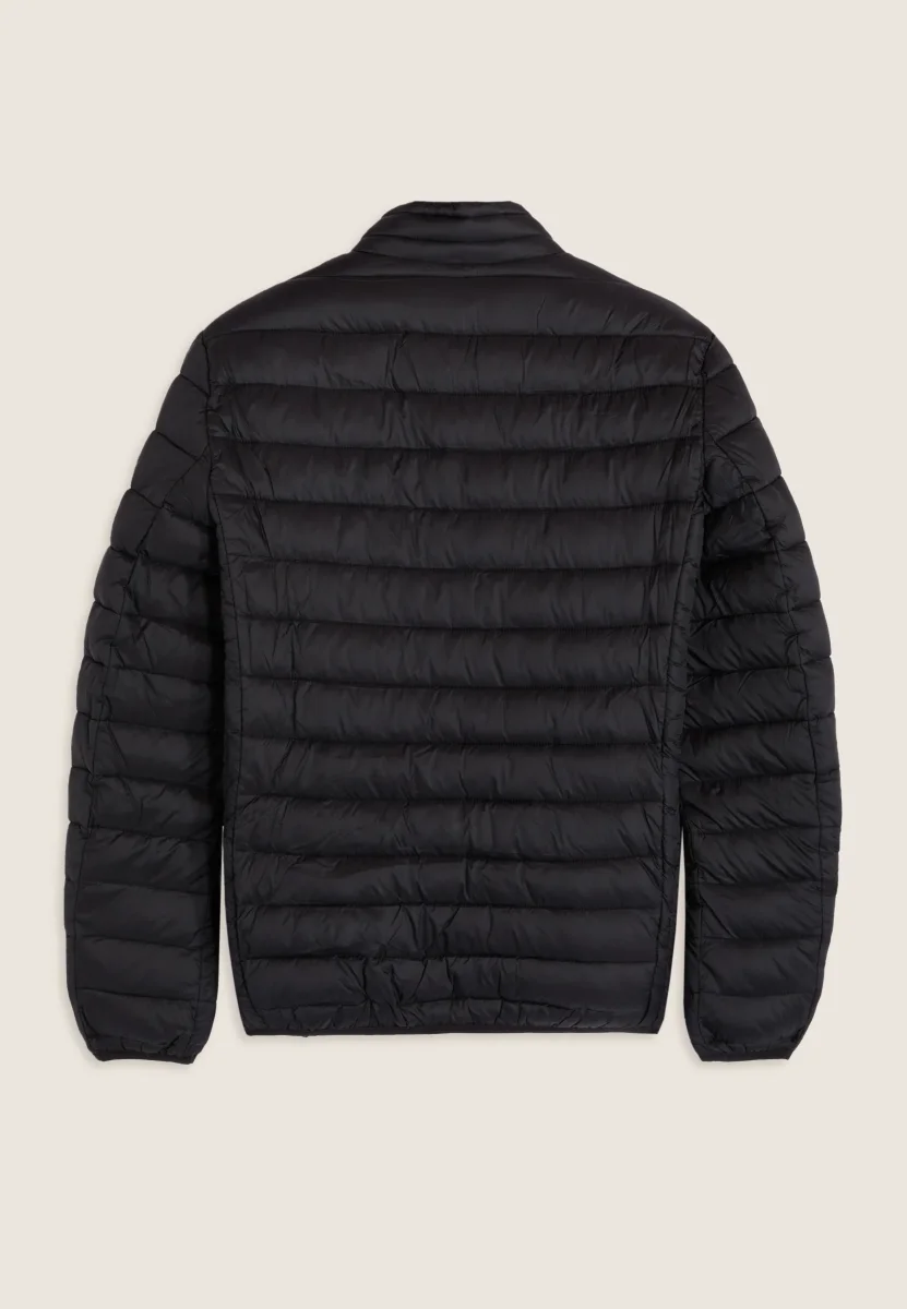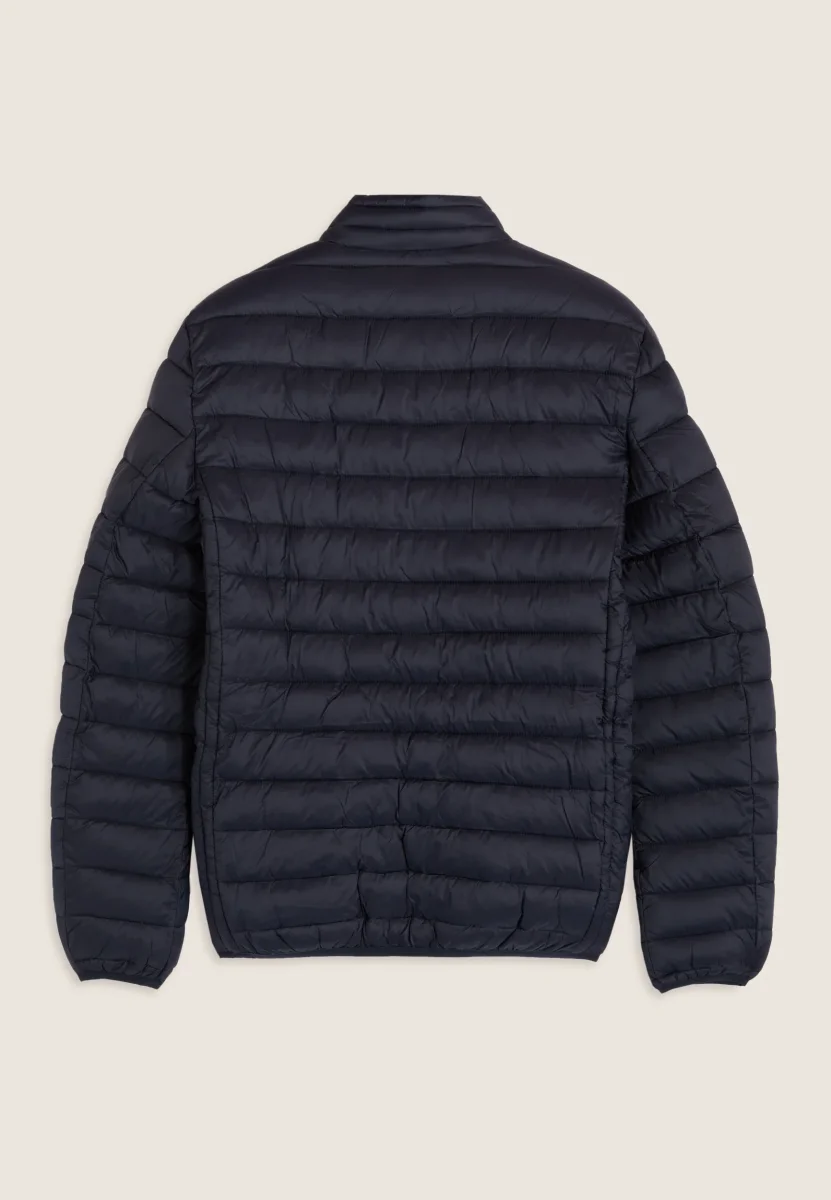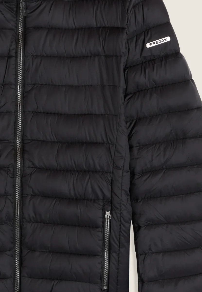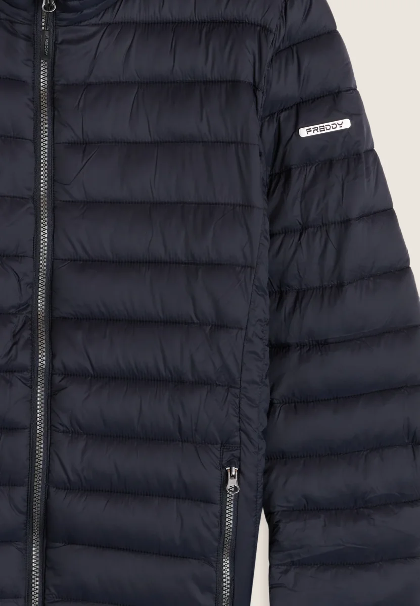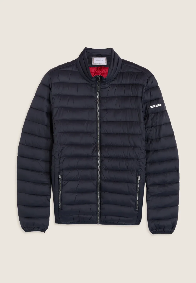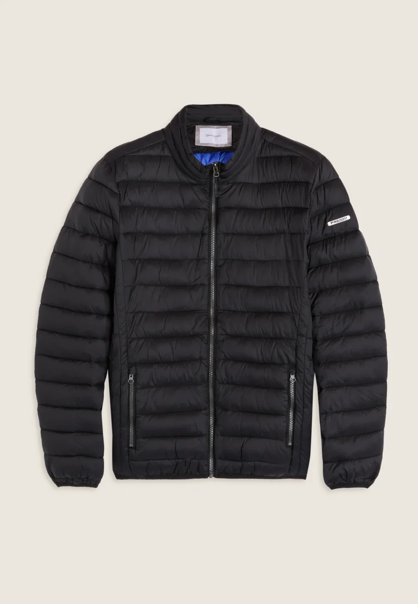 Piumino da uomo con vestibilità regular, lunghezza ai fianchi e trapuntatura orizzontale. Chiusura full zip con doppio cursore, fondo regolabile con coulisse e stopper. Dotato di cappuccio e collo alto, maniche lunghe con fondo elasticizzato in jacquard. Logo applicato sulla manica sinistra, tasche frontali con chiusura zip. L’imbottitura in fake-down è animal-friendly e garantisce ottimo isolamento, mantenendo buone prestazioni anche in ambienti umidi.