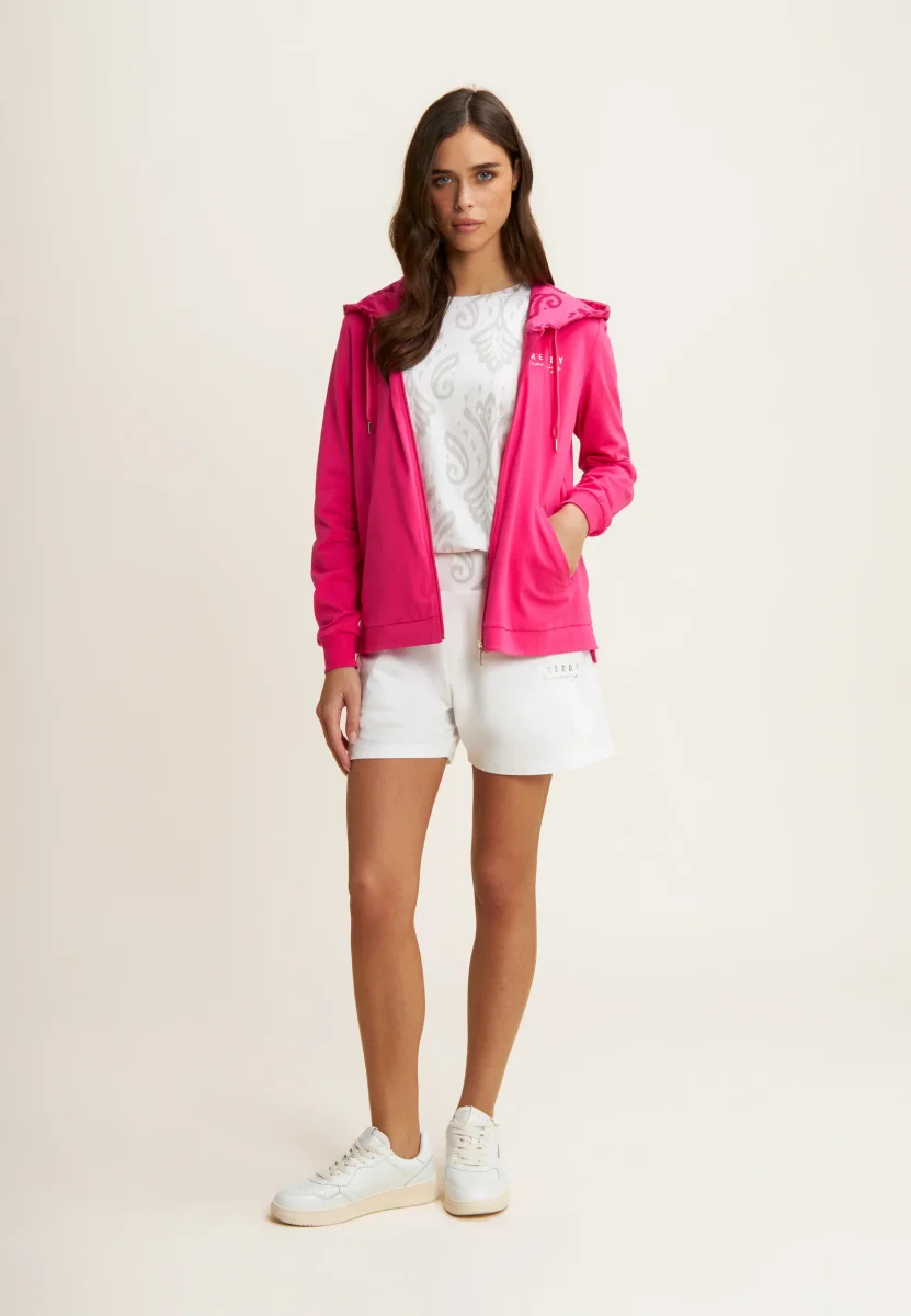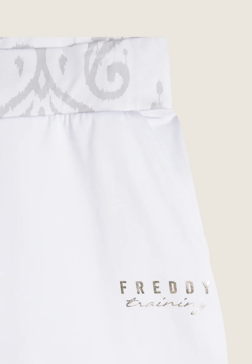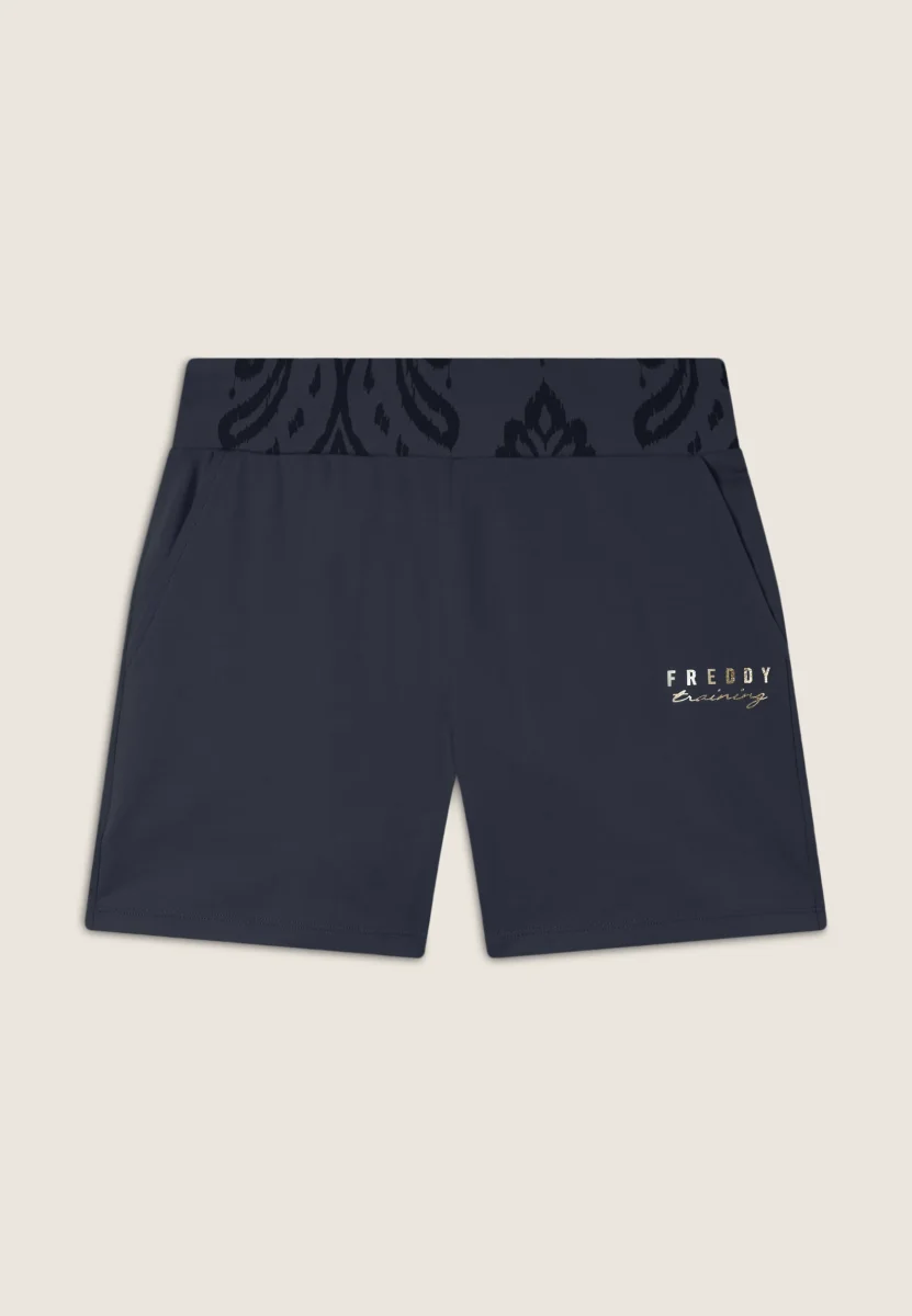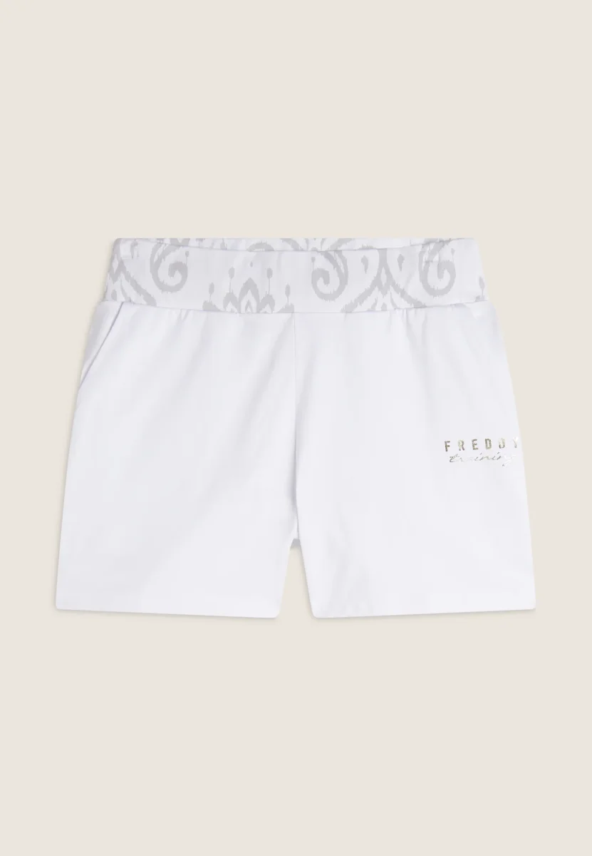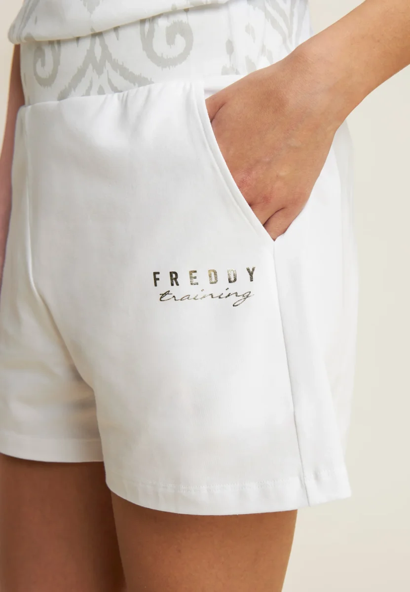 Pantaloni short regular fit in heavy jersey stretch, perfetti per un look estivo e sportivo. Con vita regular dotata di coulisse interna e fascia decorata con una stampa floreale, sono completati dalla scritta FREDDY TRAINING in oro chiaro sul fianco sinistro e dalle tasche anteriori interne per una maggiore praticità.