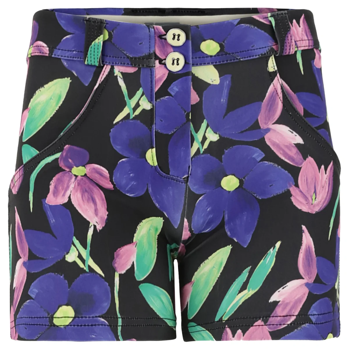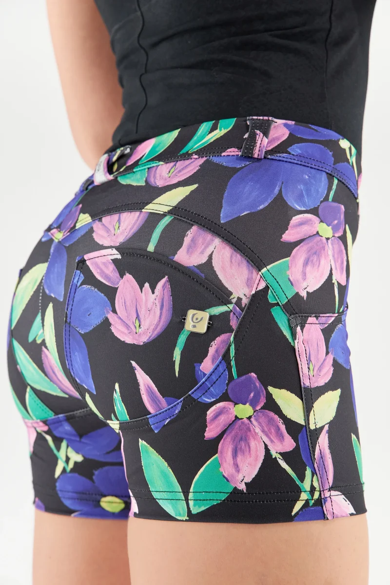 Pantaloni shorts push up della linea WR.UP® in tessuto tecnico traspirante con sfondo nero e fantasia floreale all-over. Il modello presenta vita regular con passanti e chiusura a due bottoni. Il design corto dal mood estivo si unisce al tono brioso della fantasia nel donare al capo una personalità ricca di femminilità esaltata a sua volta dalle proprietà dell’innovativa tecnologia WR.UP® brevettata da Freddy che mette in risalto le forme grazie a un particolare sistema di inserti e cuciture che donano un piacevole effetto modellante e push up. Lo speciale tessuto tecnico D.I.W.O.® (Dry In Wet Out) favorisce la termoregolazione della pelle e trasporta l’umidità verso l’esterno. Con Freddy comodità e libertà di movimento sono la cifra del tuo stile sempre al top in ogni situazione.