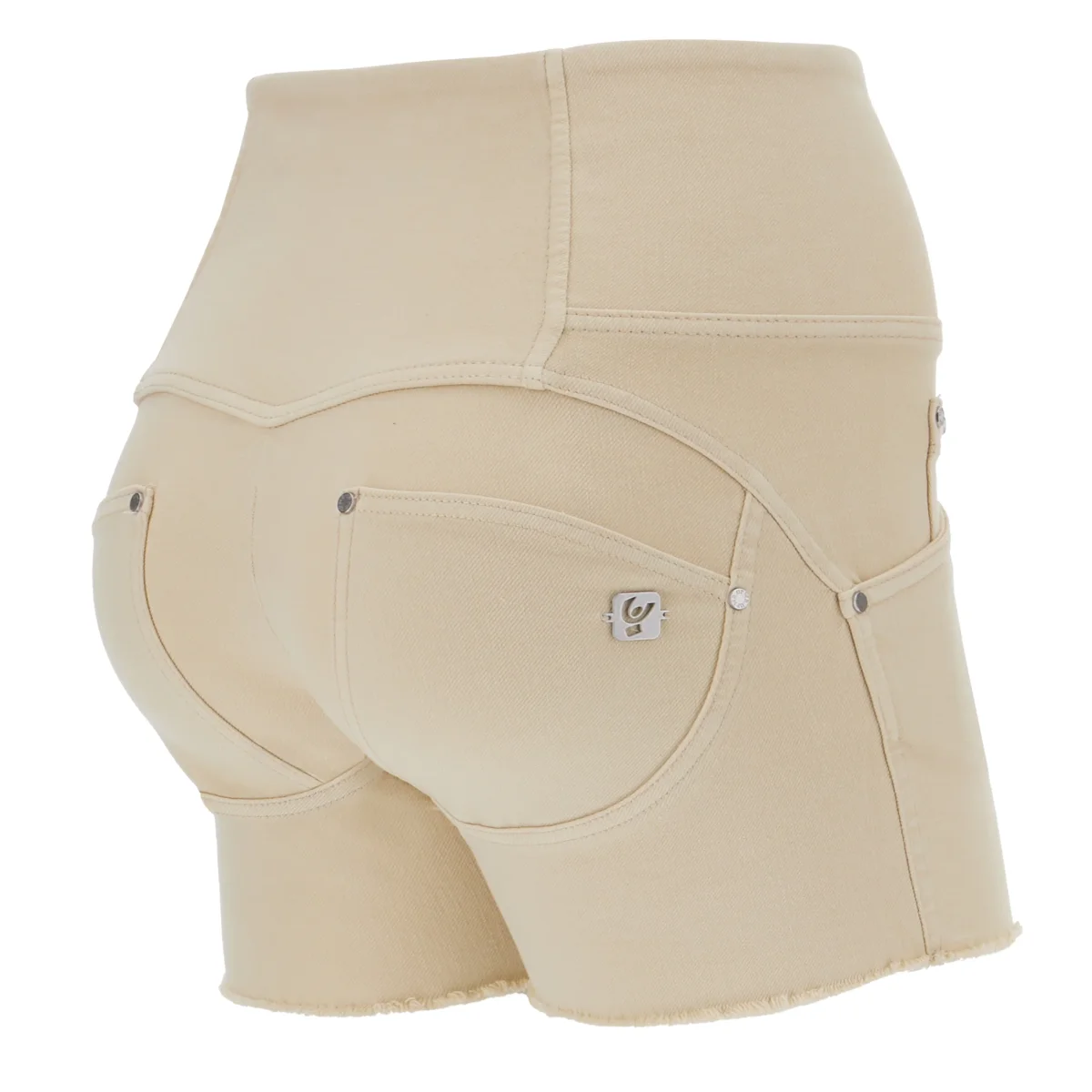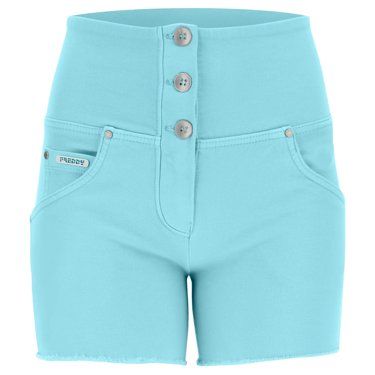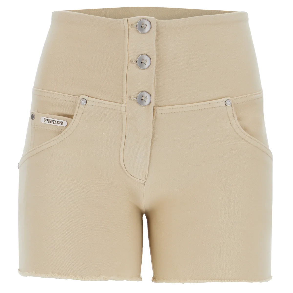 Shorts push della linea WR.UP® a vita alta con chiusura a tre bottoni e tasche frontali e posteriori reali. Concepiti per valorizzare linee senza rinunciare al piacere della libertà di movimento grazie al design e all’innovativa tecnologia WR.UP® brevettata da Freddy che esalta la silhouette e dona un effetto modellante e sollevante dato da un particolare sistema di inserti e cuciture. Hanno vestibilità skinny per una piacevole aderenza alle forme. Il modello è realizzato in tessuto navetta elasticizzato ecologico tinto in capo prodotto con cotone organico, vari filati green e il TENCEL™ Lyocell, una fibra ricavata dalla pianta di eucalipto.