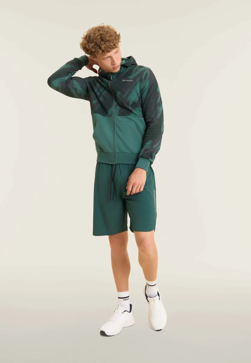 Shorts da uomo con vestibilità slim e fondo dritto con spacchi laterali. La vita è elasticizzata e regolabile con coulisse. Dotati di tasche anteriori e taschino posteriore con zip. Le cuciture sono pensate per un fit ottimale. Il tessuto woven stretch garantisce resistenza e traspirazione. Il logo sul fondo completa i dettagli di stile.