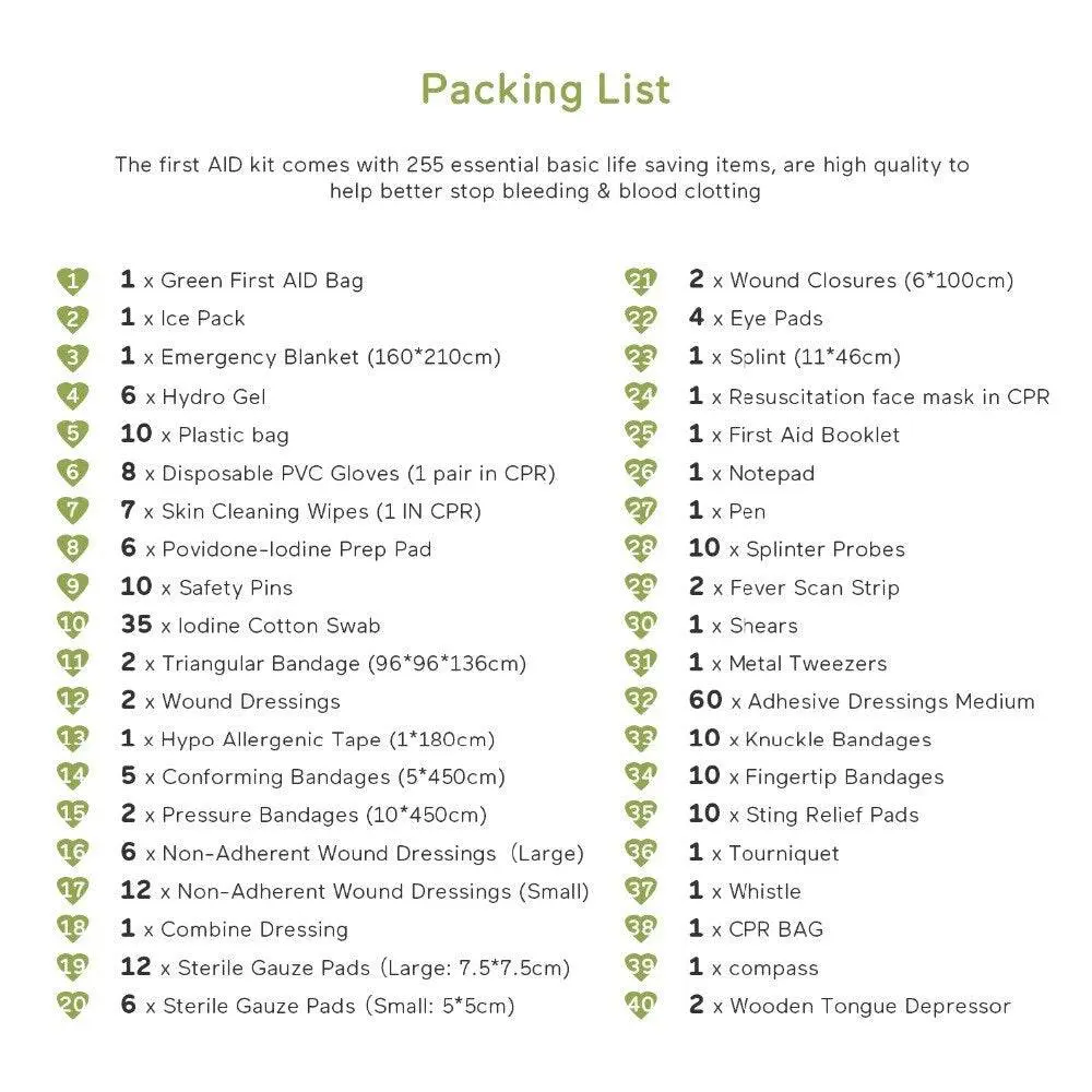 Trousse de premiers secours labelisée (1) | Pack de glace instantané (1) | Couverture de survie (1) 160*210CM | Hydrogel (6) 3.5g | Sac plastique (10) | Gants chirurgicaux (8) | Lingettes désinfectantes (7) | Tampons désinfectants de povidone iodée (6) | Épingles de sûreté (10) | Bâtonnet de coton iodé (35) | Bandage Triangulaire (2) 96*96*136CM | Compresse (2) | Ruban adhesif hypoallergénique (1) 2.5*180CM | Bandages conformes (5) 5*450CM | Bandages élastiques (2) 10*450CM | Compresse non adhérente (6) 7.5*7.5CM | Compresse non adhérente (12) 5*5CM | Large compresse (1) | Tampon de gaze stérile (12) 7.5*7.5CM | Tampon de gaze stérile (6) 5*5CM | Suture cutanée adhésive (2) 6*100CM | Cache oeil (4) | Attelle (1) 11*46CM | Ecran facial de réanimation (1) | Guide de survie (1) | Bloc-notes (1) | Stylo (1) | Pince a écharde (10) | Thermometre bande frontale (2) | Ciseaux (1) 14.5CM | Pince à épiler (1) 12CM | Compresses adhésives (60) | Pansement aux articulations (10) | Pansement pour les doigts (10) | Tampon de soulagement des piqûres (10) | Tourniquet (1) | Sifflet (1) | Sac de reanimation RCR (1) | Boussole (1) | Abaisse-langue en bois (2) | TOTAL 255 Pcs