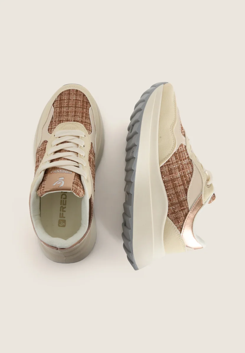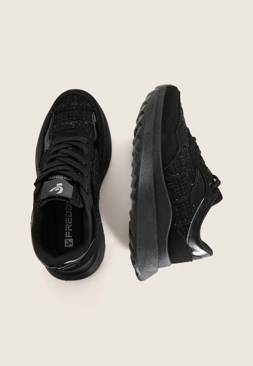 Queste sneakers in similpelle e tessuto, con dettagli in vernice, offrono un design raffinato e contemporaneo. I lacci in tessuto e gli occhielli in metallo aggiungono un tocco di eleganza, mentre la soletta removibile « Massage » garantisce un comfort superiore ad ogni passo. Il battistrada in gomma antiscivolo assicura una calzata sicura, e i piccoli loghi Freddy sulla linguetta e sul lato esterno completano il look. Perfette per ogni momento della giornata, queste scarpe combinano stile e praticità.