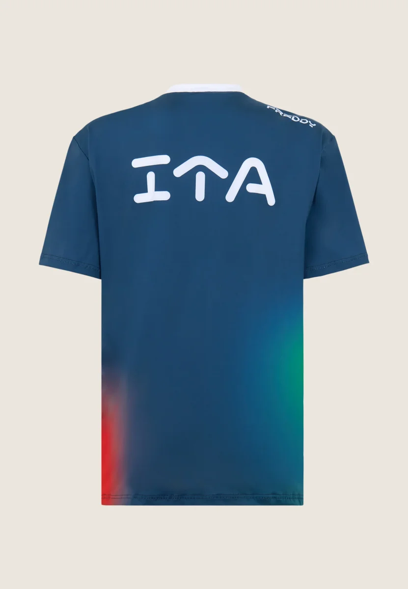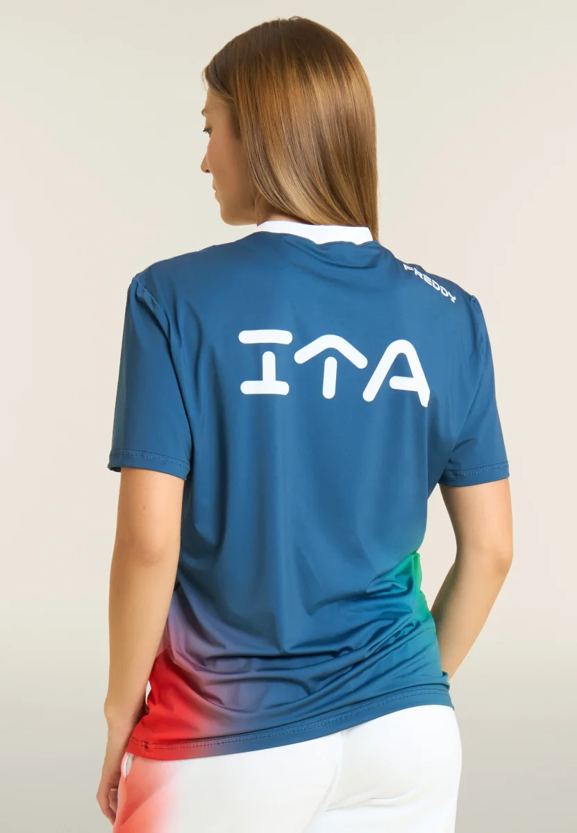 Il tessuto avvolge e segue i movimenti del corpo con naturalezza, mantenendo leggerezza e comfort anche nelle attività più intense. Le sfumature visive richiamano l’energia del beach volley, mentre loghi FREDDY, FIPAV e maxi stampa ITA sul retro celebrano l’identità della Nazionale.