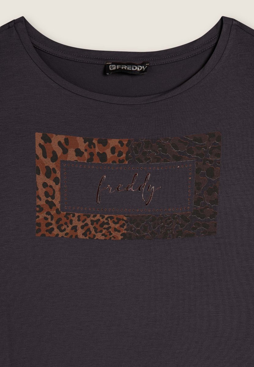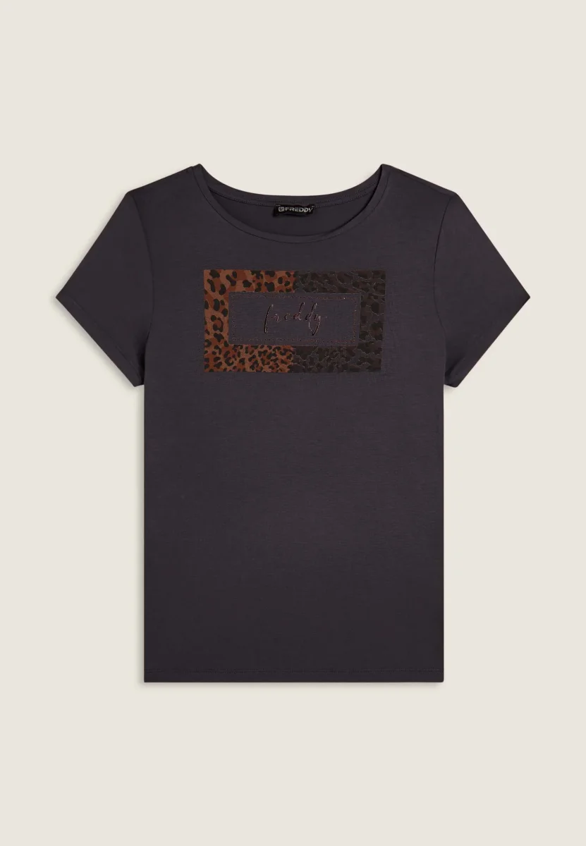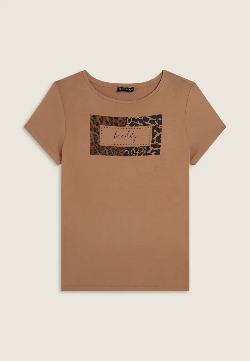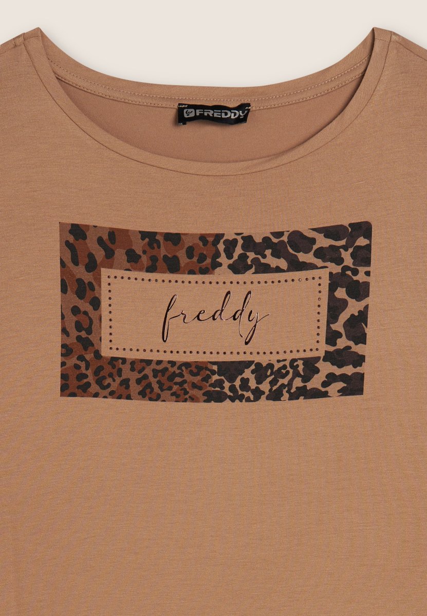T-shirt donna in jersey viscosa elasticizzato con stampa animalier centrale e logo FREDDY arricchito da strass. Vestibilità comfort con spacchetti laterali sul fondo.