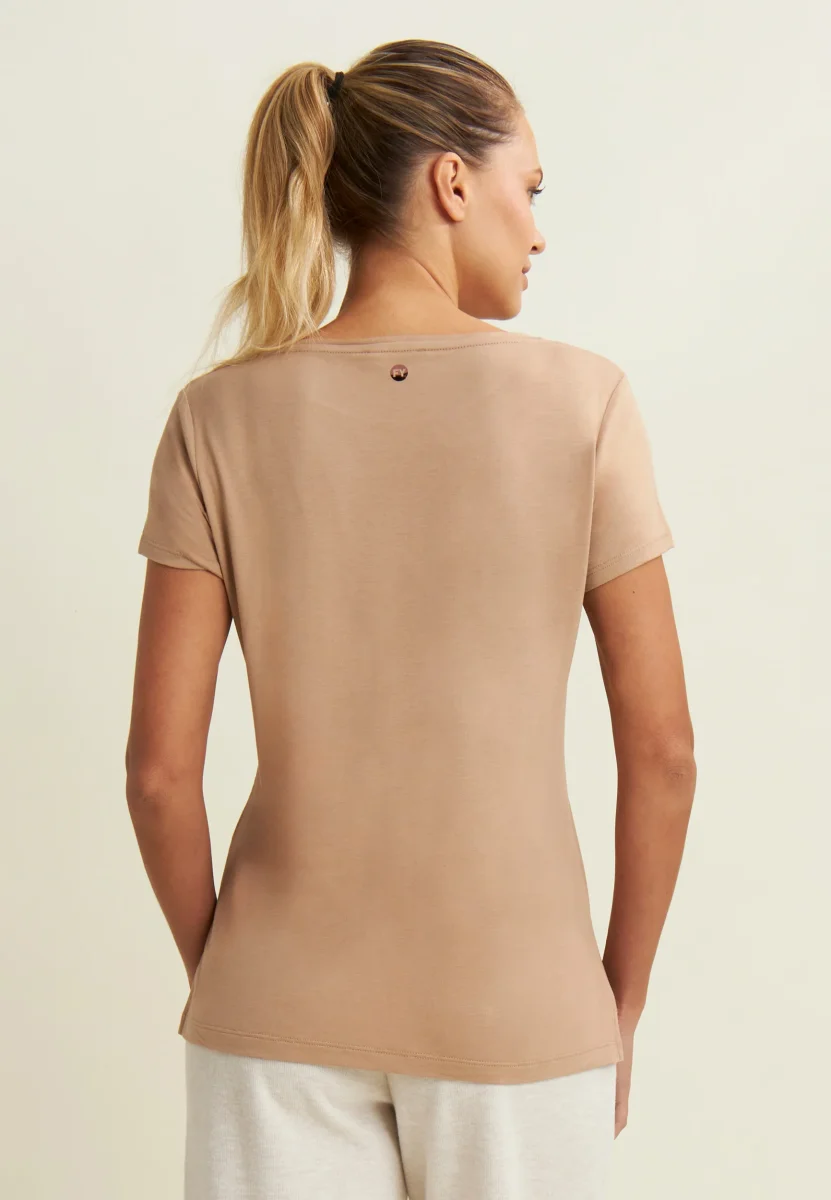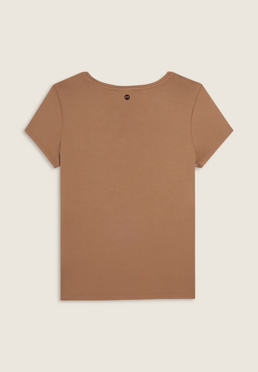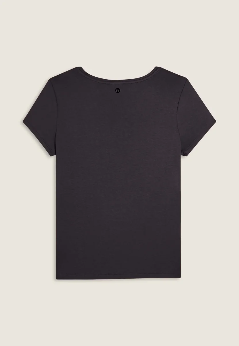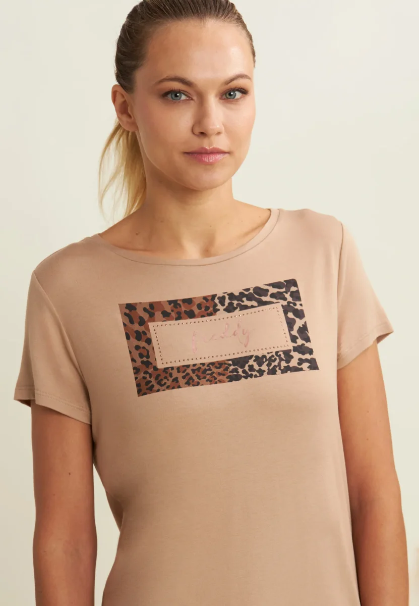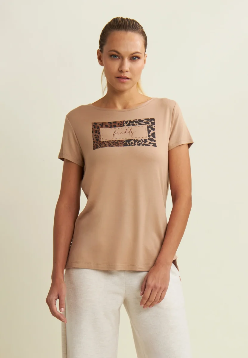 T-shirt donna in jersey viscosa elasticizzato con stampa animalier centrale e logo FREDDY arricchito da strass. Vestibilità comfort con spacchetti laterali sul fondo.