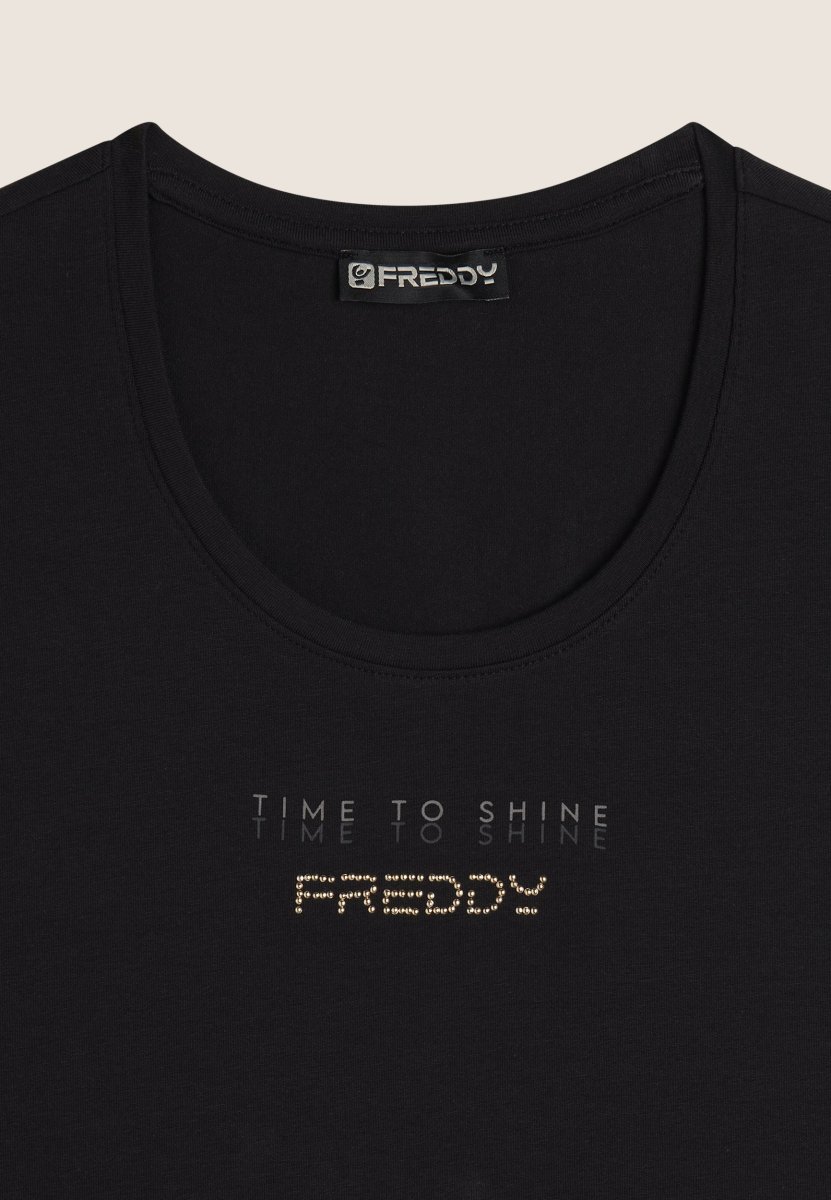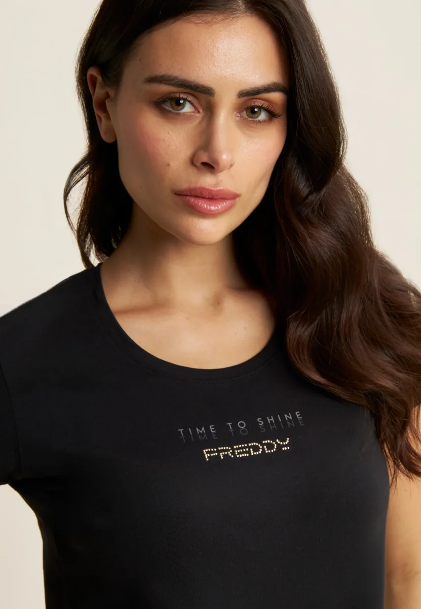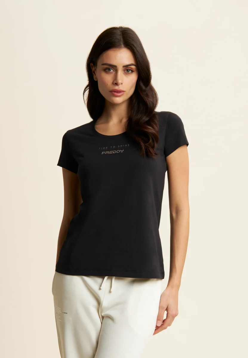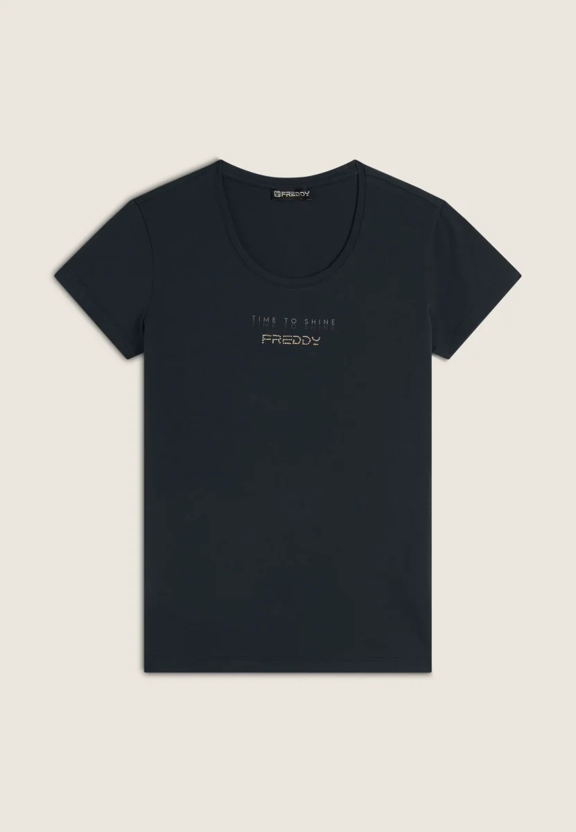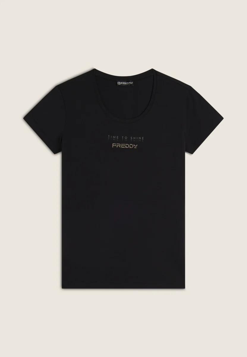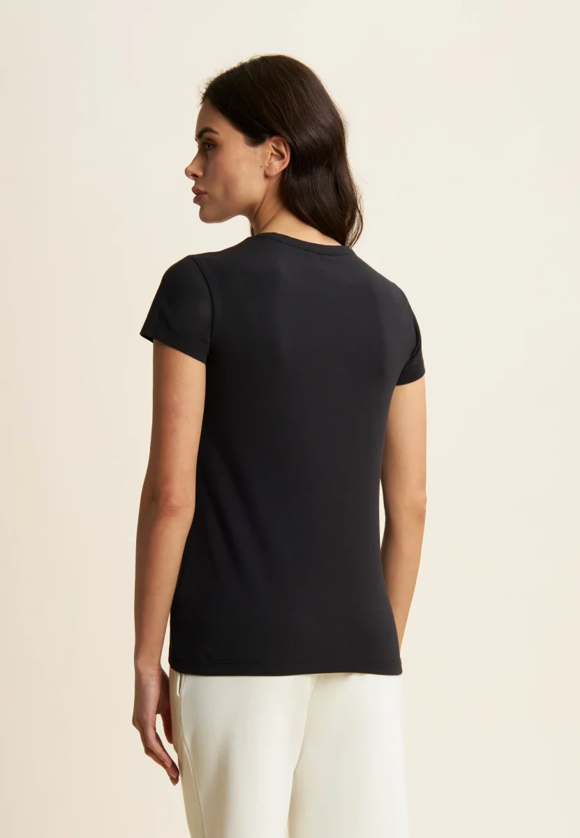 T-shirt a manica corta in Heavy Jersey Stretch con scollo tondo. La grafica bicolore sul fronte, decorata da perline dorate, aggiunge un tocco di stile a questa maglietta dal taglio classico.