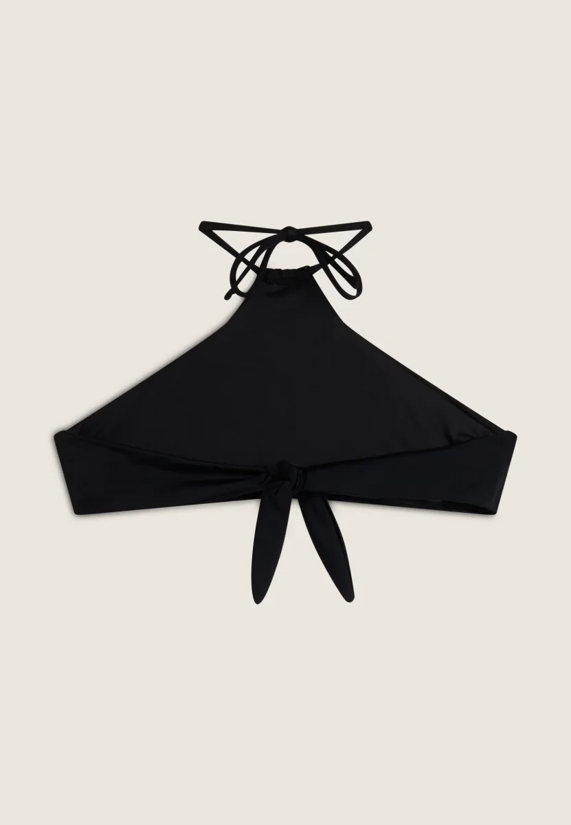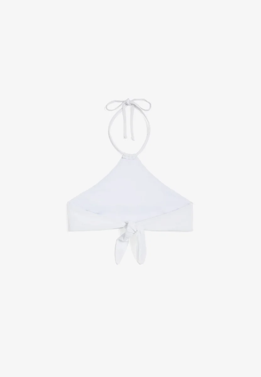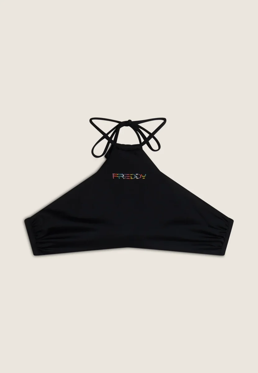 Questo top bikini copre completamente il seno e lascia liberi dorso e spalle per la massima libertà di movimento anche in acqua. L’allacciatura è regolabile sia sul collo con laccio sottile, sia sulla schiena dove è a fiocco. Il logo composto da strass colorate dona un allegro tocco di stile.