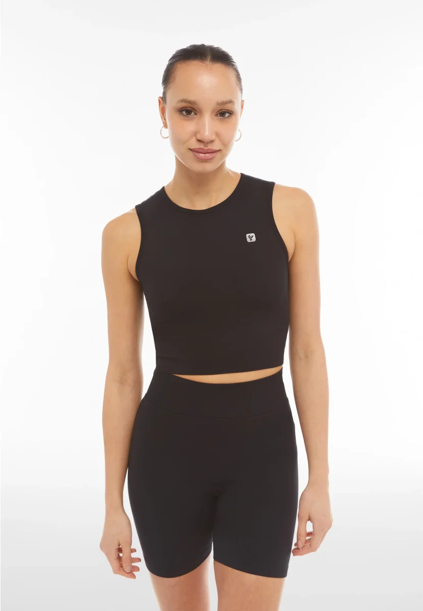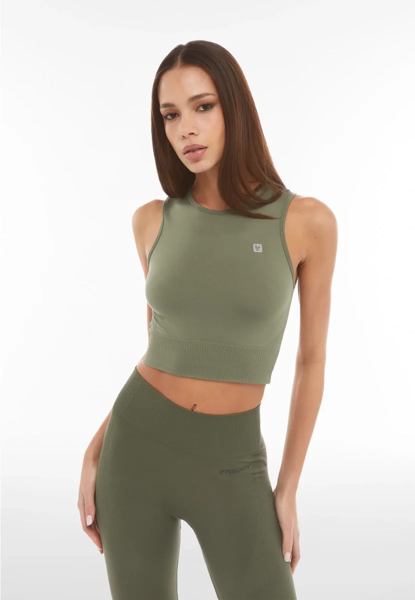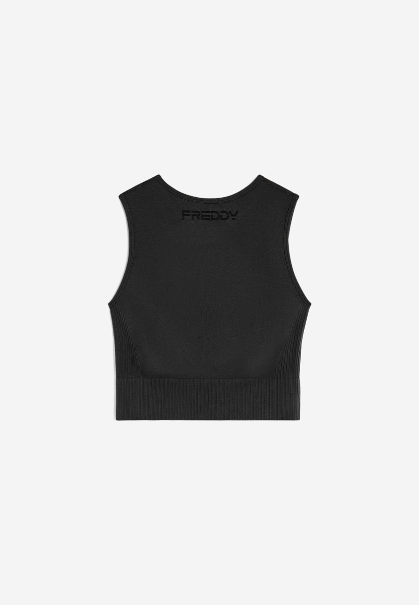 Top corto in vita senza maniche in tessuto seamless realizzato in poliammide elasticizzato, ecosostenibile perché ottenuto per il 60% da materiali riciclati.