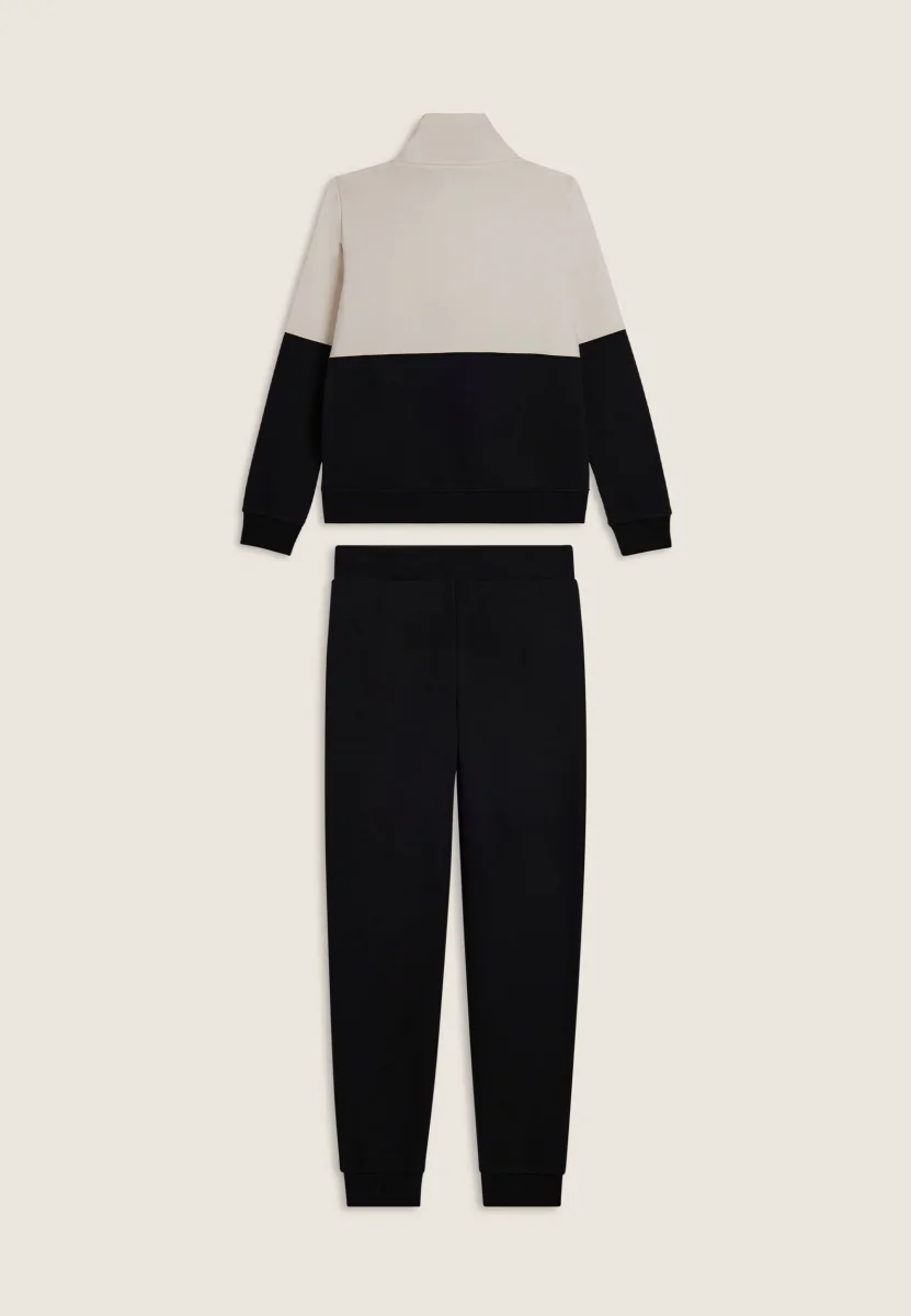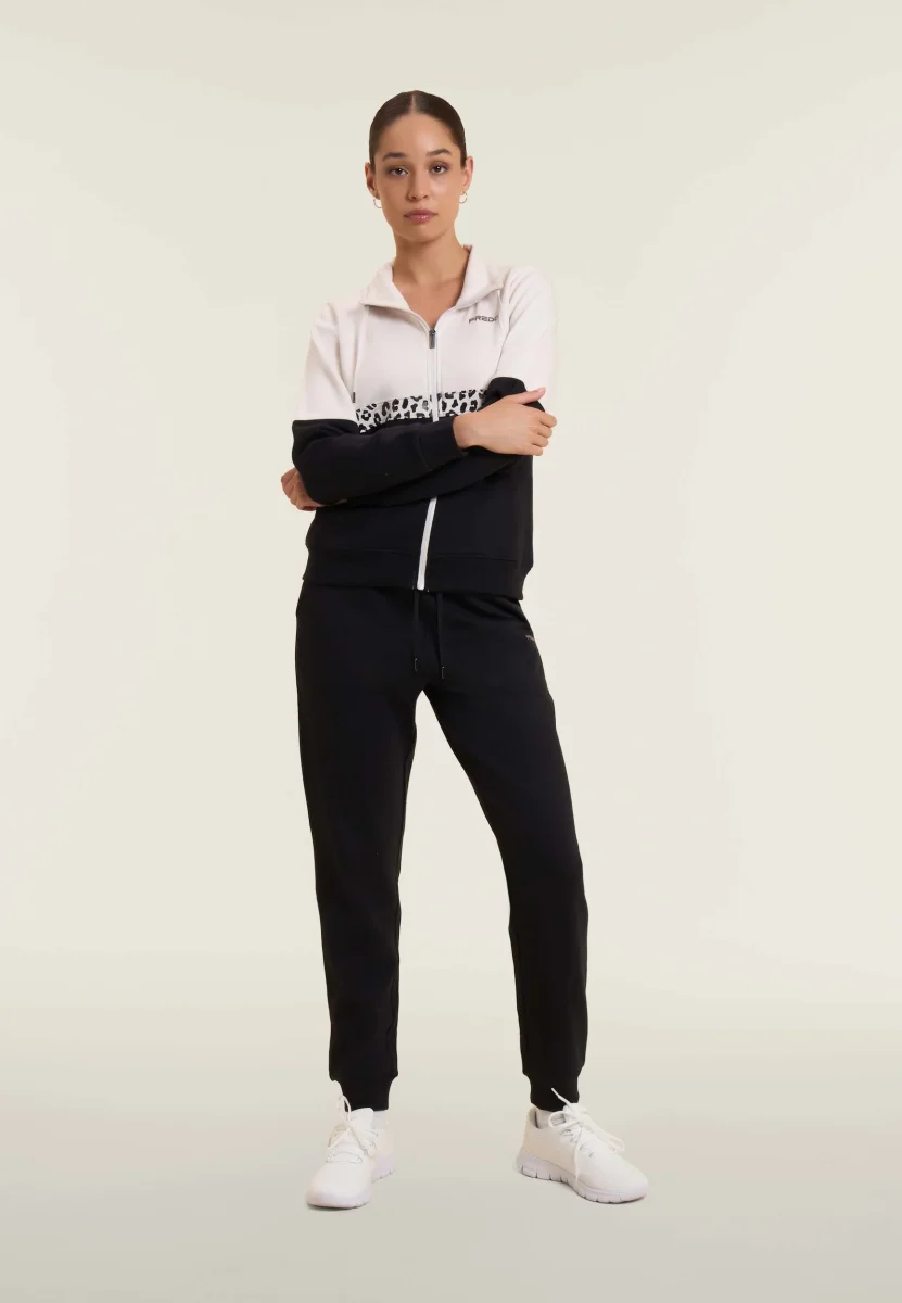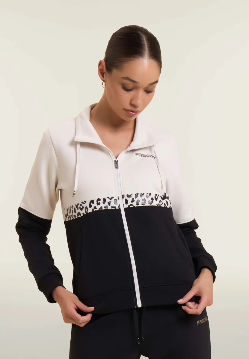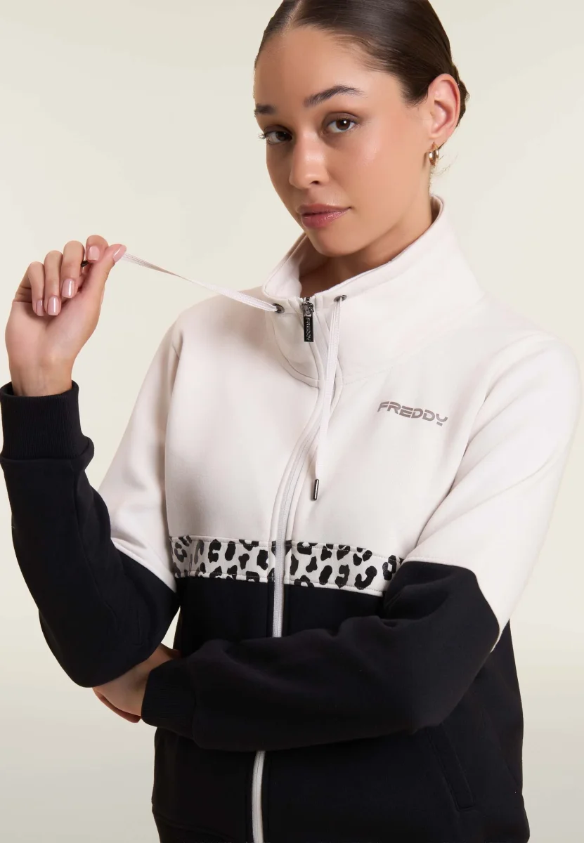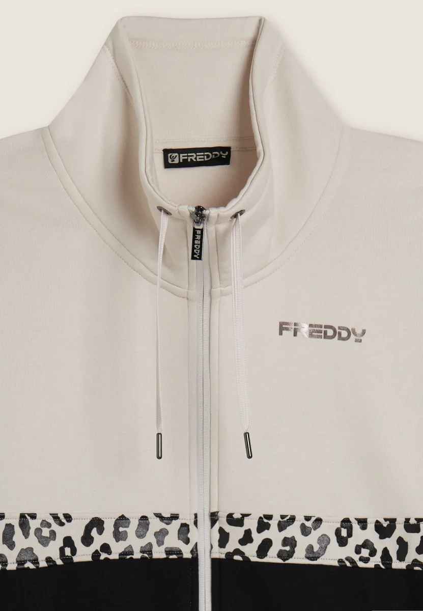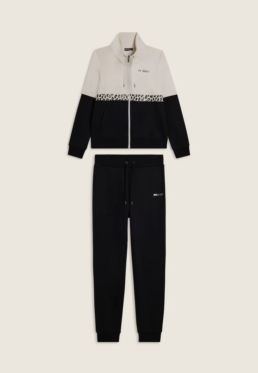 Tuta grintosa e confortevole in felpa garzata elasticizzata, perfetta per le attività quotidiane. La felpa con zip ha una fascia in costina sul fondo, collo alto con coulisse e maniche lunghe con polsini. Al centro del busto è presente un’inserto animalier che aggiunge carattere al look. I pantaloni hanno gamba con fondo a polsino in costina, vita elasticizzata con coulisse e una linea fluida. Il logo Freddy è stampato sul petto e sul fianco sinistro dei pantaloni. Entrambi i capi sono dotati di tasche.