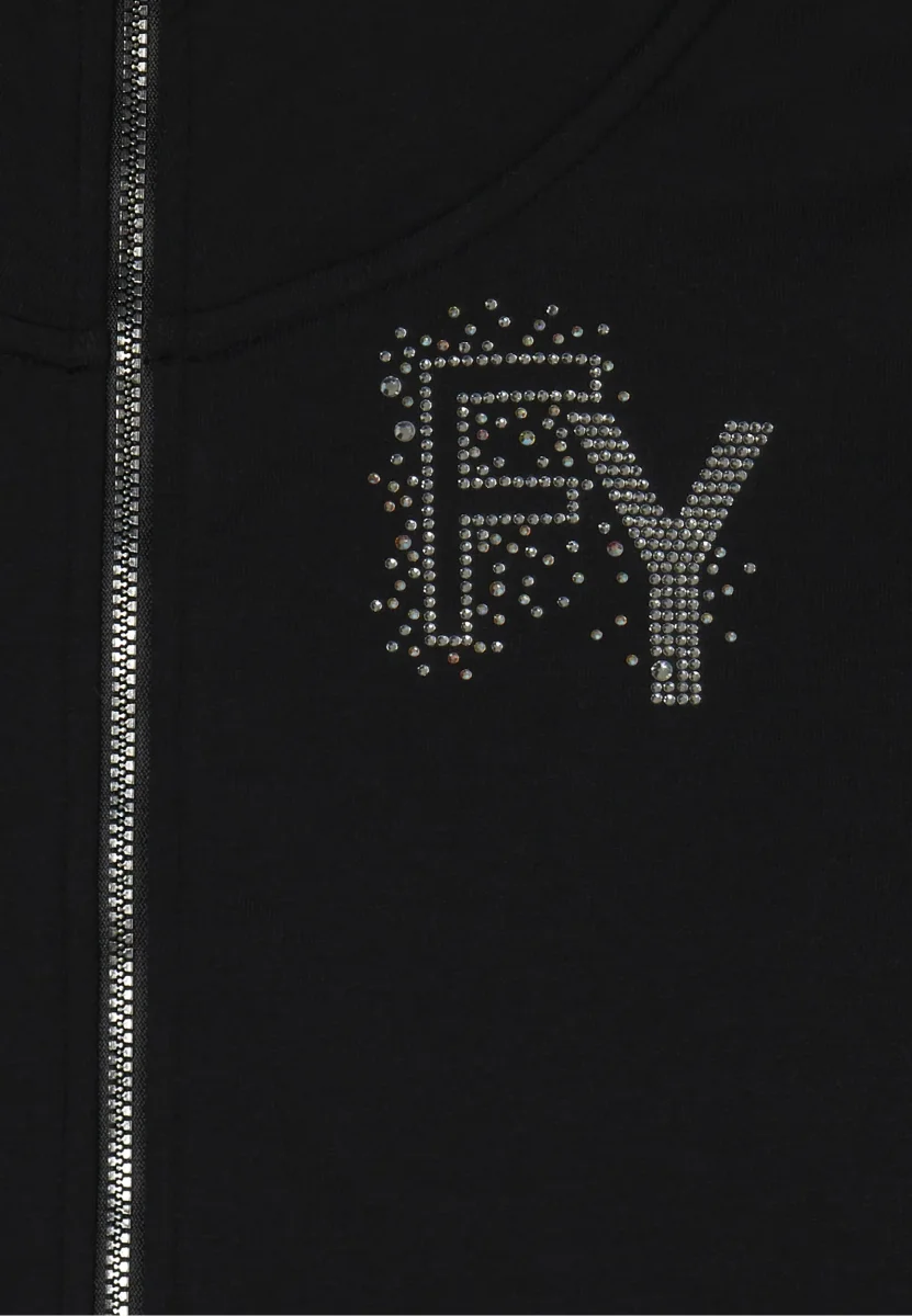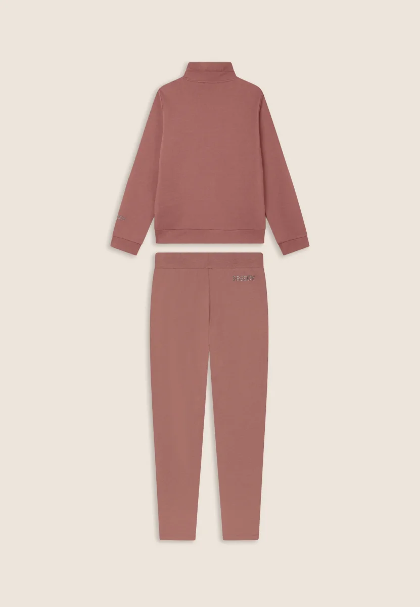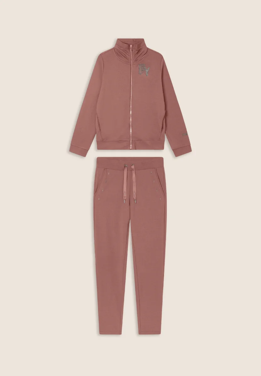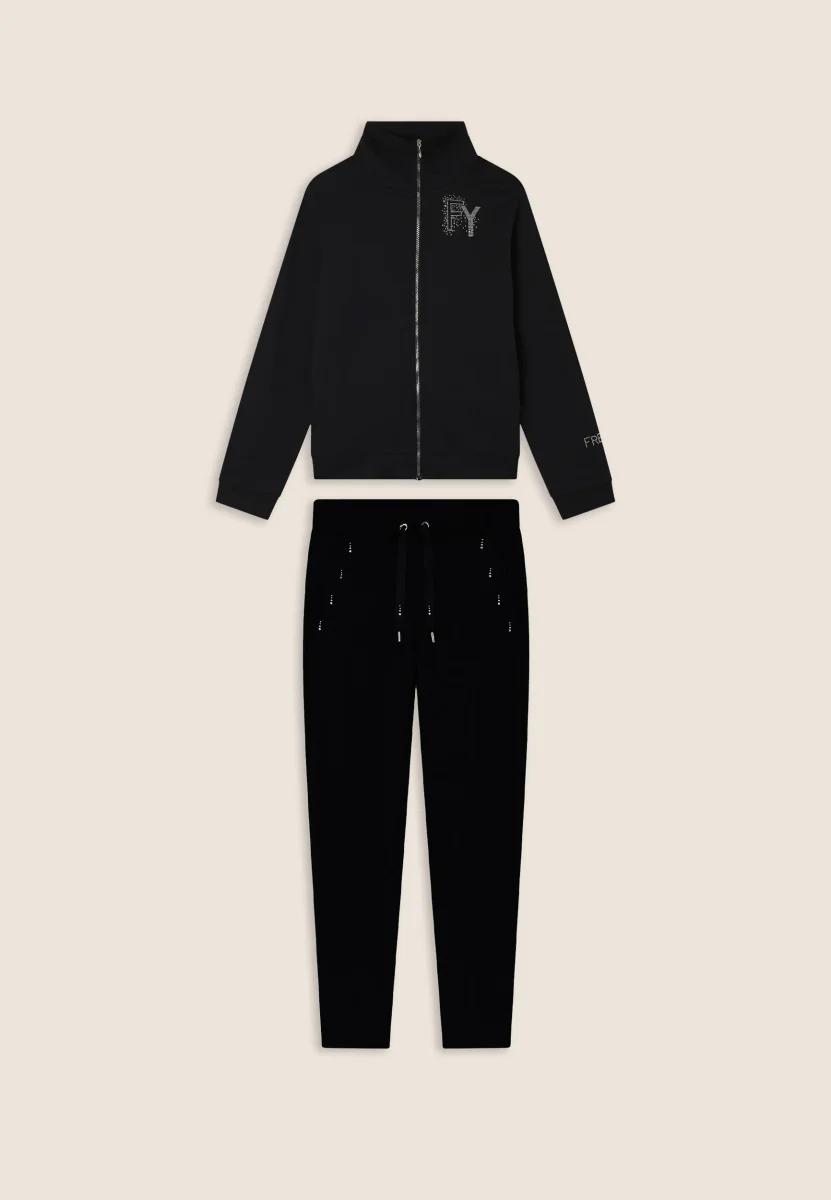 Leggerezza, morbidezza e stile si fondono in questa raffinata tuta sportiva da donna realizzata in French Terry Modal, un tessuto traspirante e piacevole sulla pelle. La felpa con zip è impreziosita da dettagli eleganti come il collo alto bordato in tessuto effetto seta e i loghi FY e FREDDY in strass, posizionati rispettivamente sul cuore e sul fondo manica sinistro. Le tasche a filetto aggiungono funzionalità a un capo che non rinuncia al glamour, perfetto per lo sport ma anche per il tempo libero.