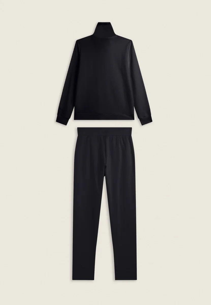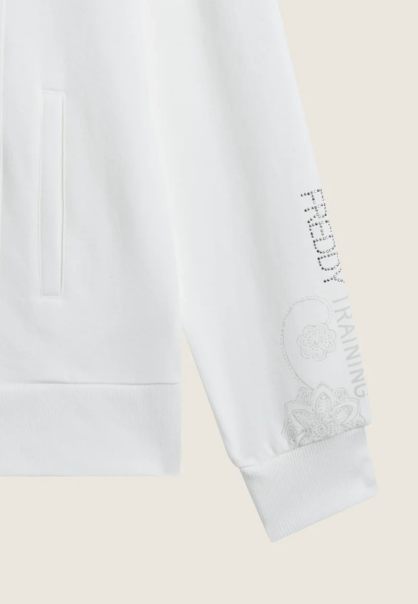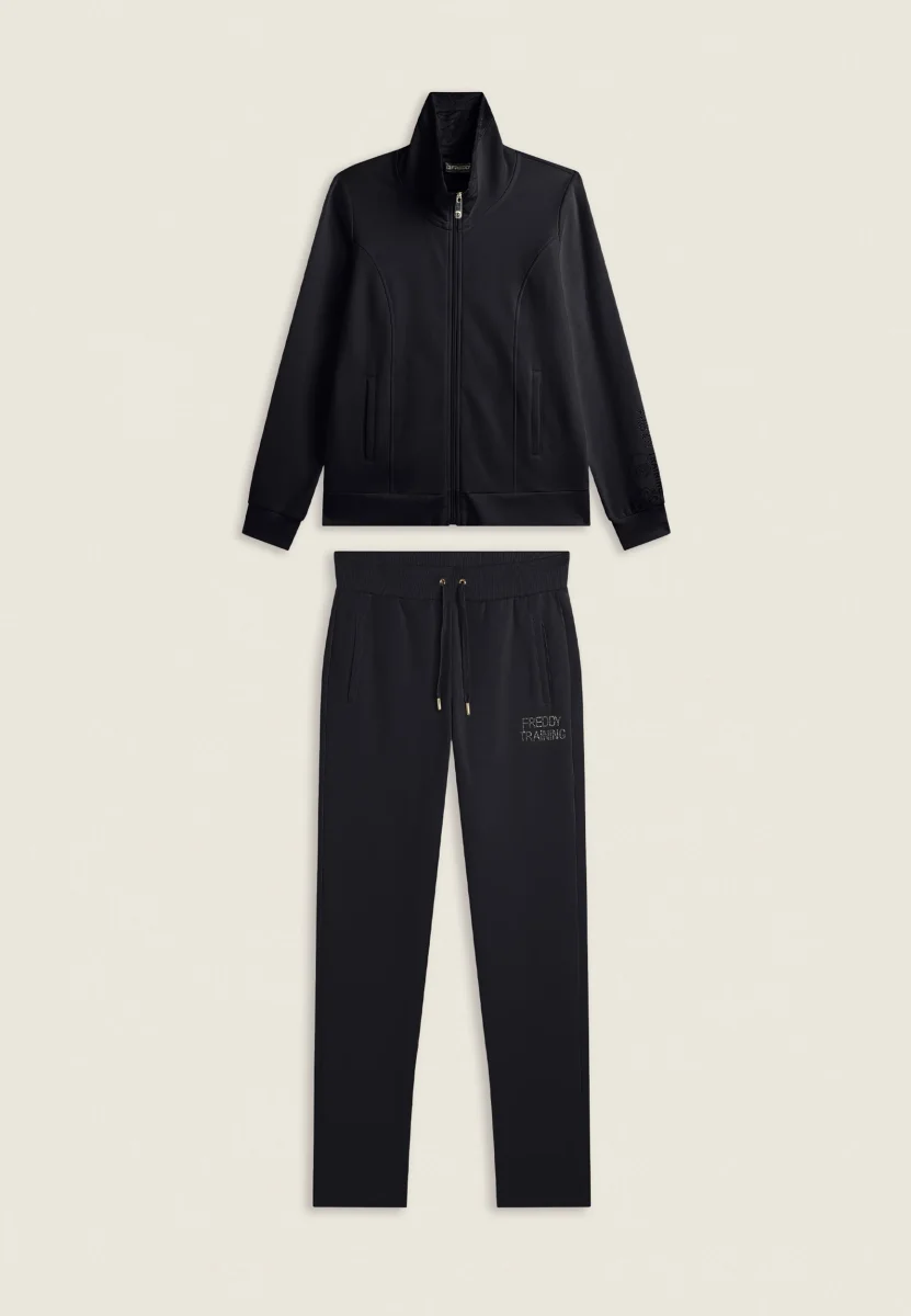 Questa tuta sportiva da donna unisce comfort e stile in ogni dettaglio. La felpa regular fit in felpa garzata è impreziosita dalla grafica FREDDY TRAINING in borchie sul fondo manica, incorniciata da un’elegante texture paisley. Il collo alto, foderato internamente con lo stesso motivo, regala un tocco originale, mentre le tasche interne a filetto e i polsini in costina assicurano funzionalità e tenuta durante il movimento.