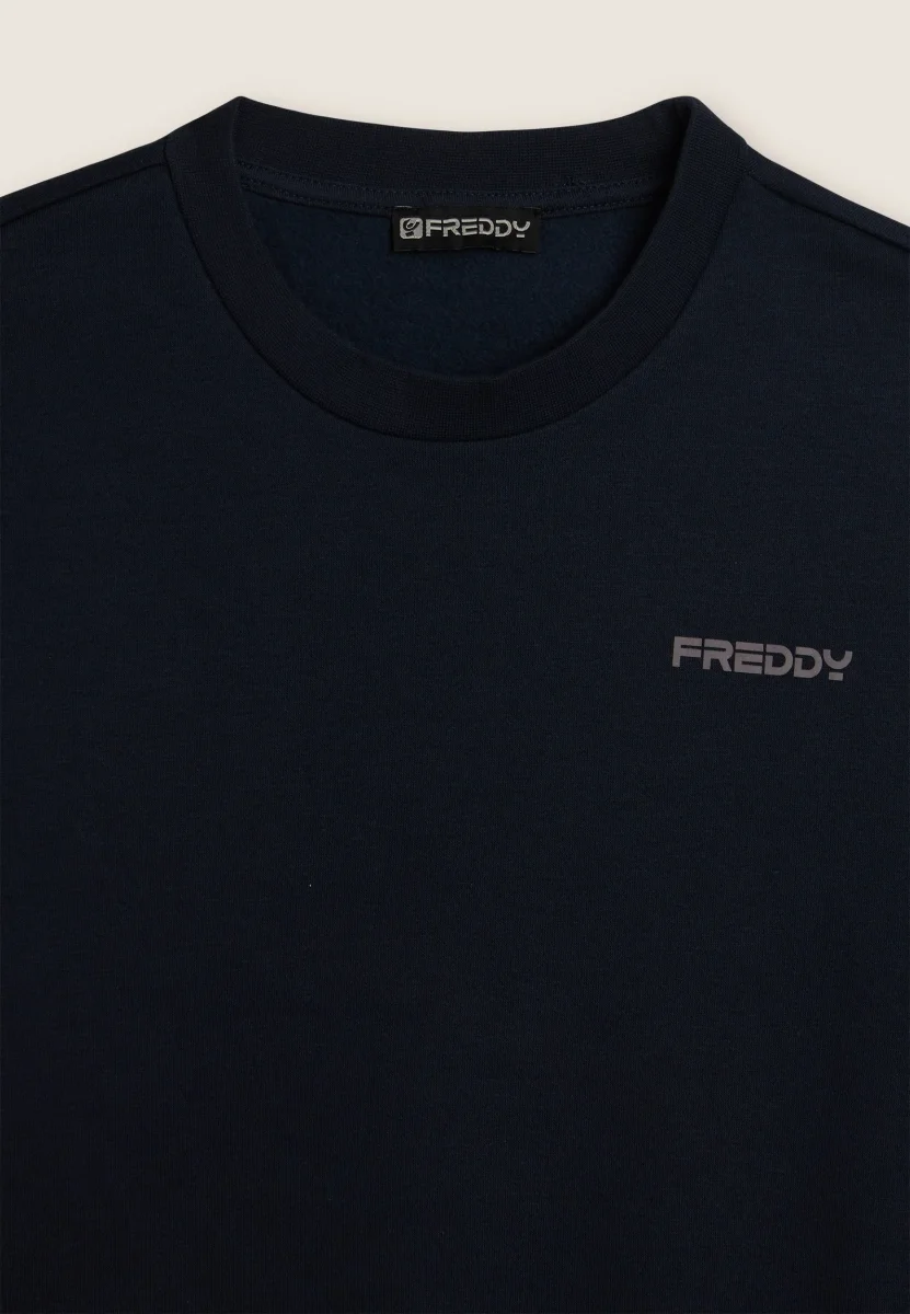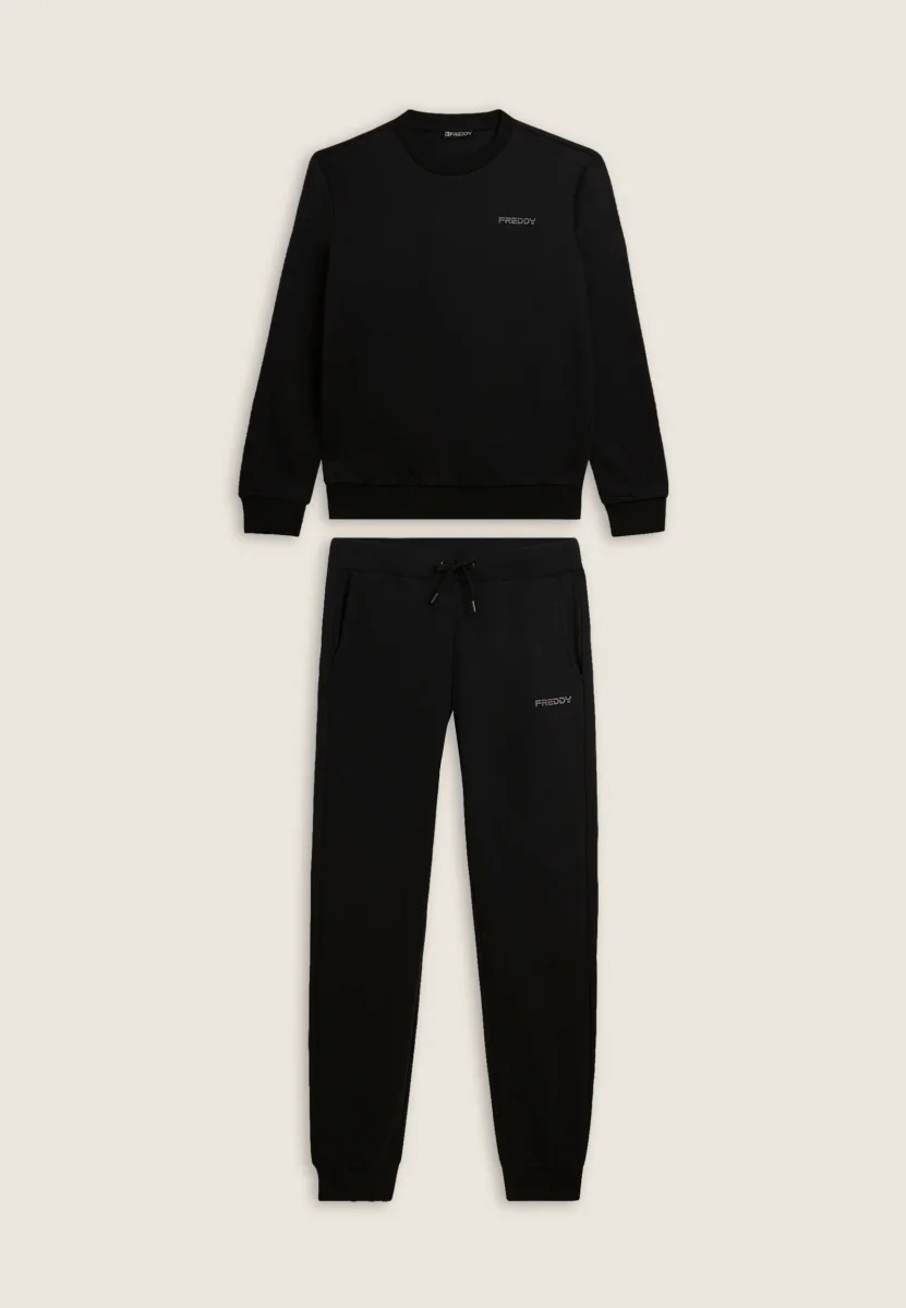 Tuta sportiva da uomo in felpa garzata con vestibilità regular. La felpa presenta uno scollo girocollo e fondo in costina, maniche lunghe con polsini per un fit comodo. I pantaloni hanno vita regular in costina con coulisse e fondo a polsino. Logo FREDDY stampato sul cuore e sul fianco sinistro dei pantaloni. Tasche interne anteriori pratiche per i pantaloni.