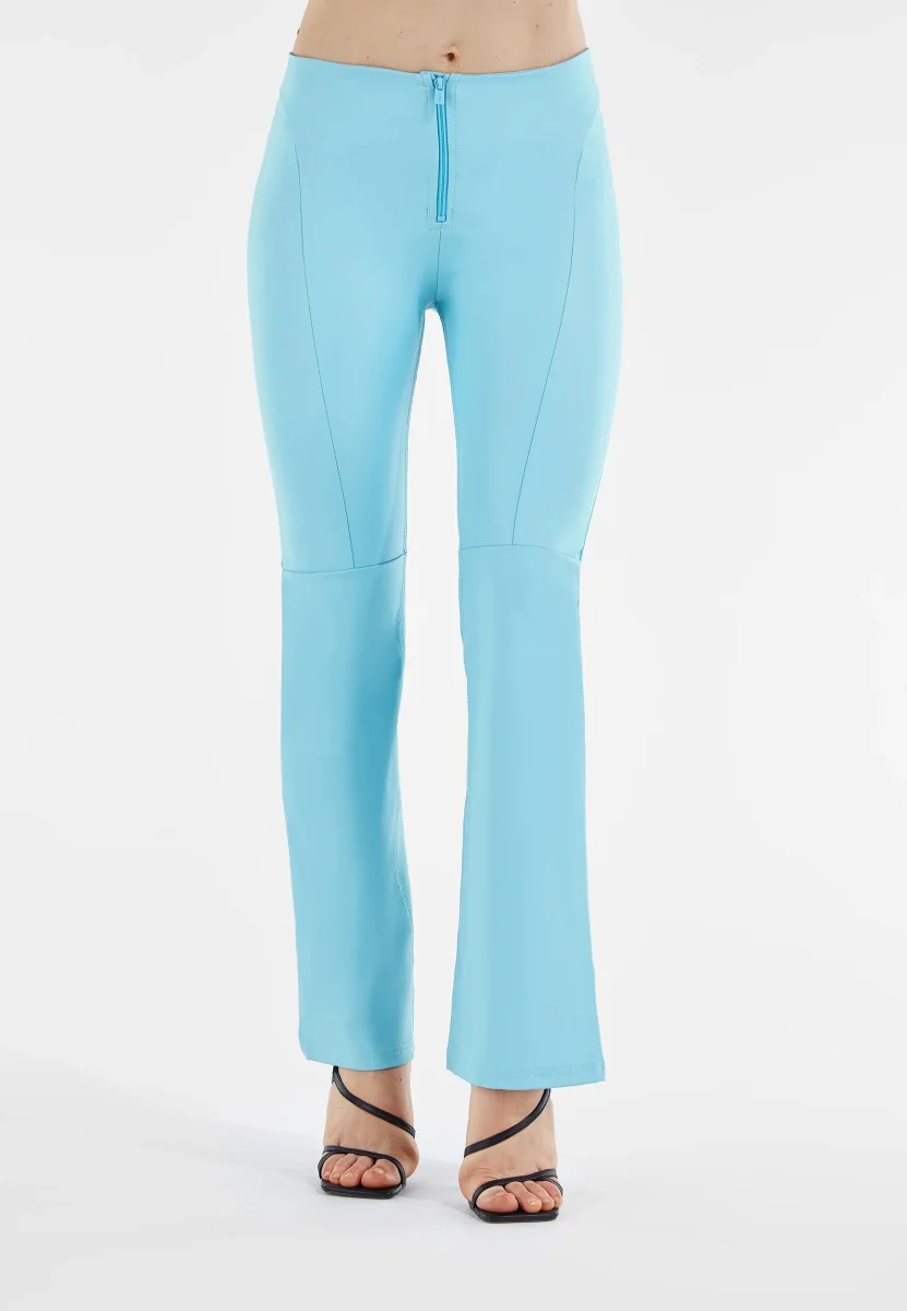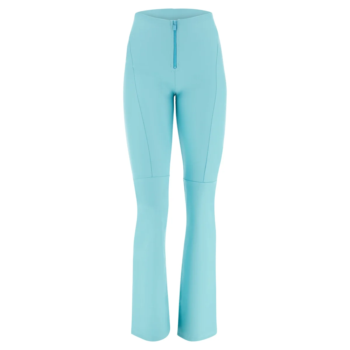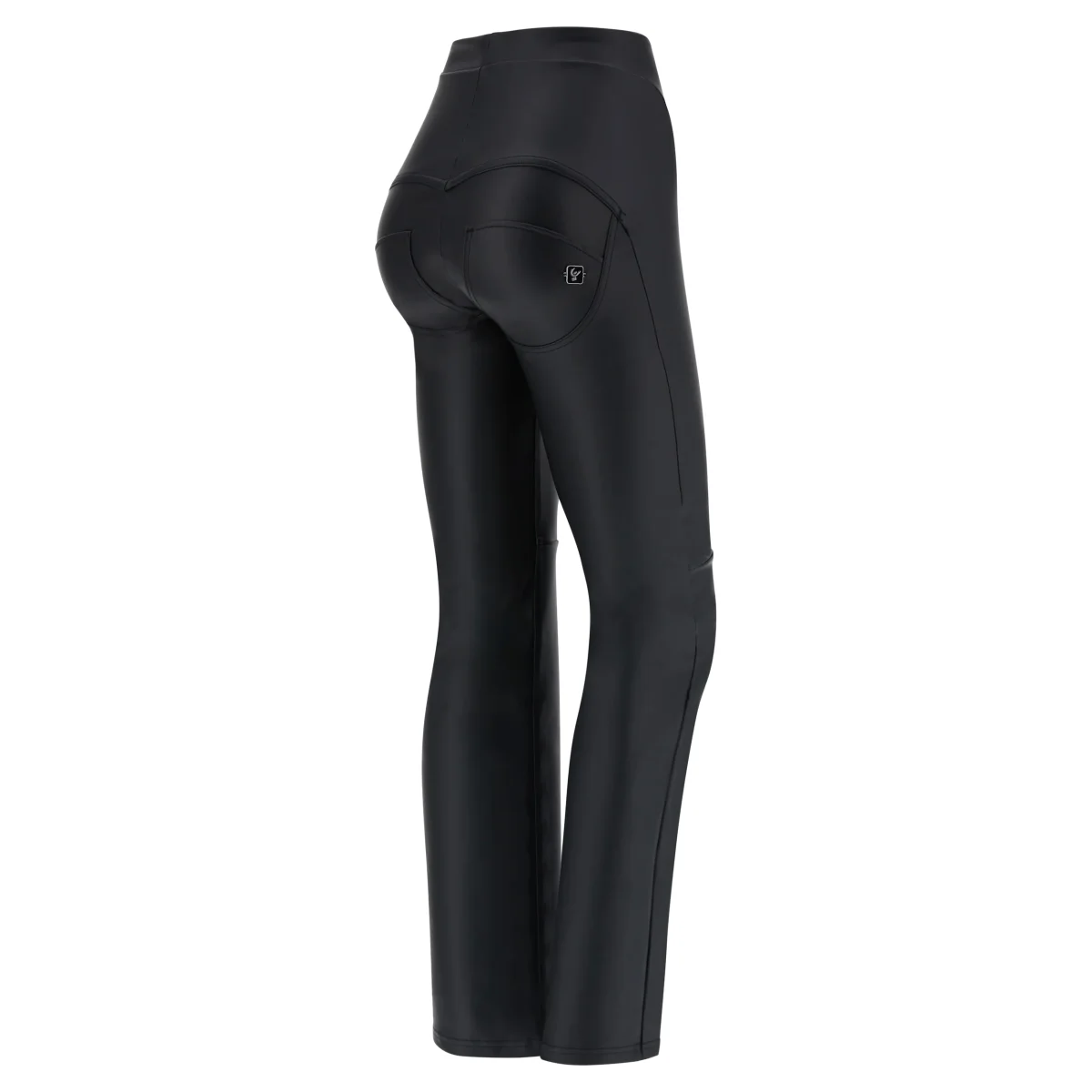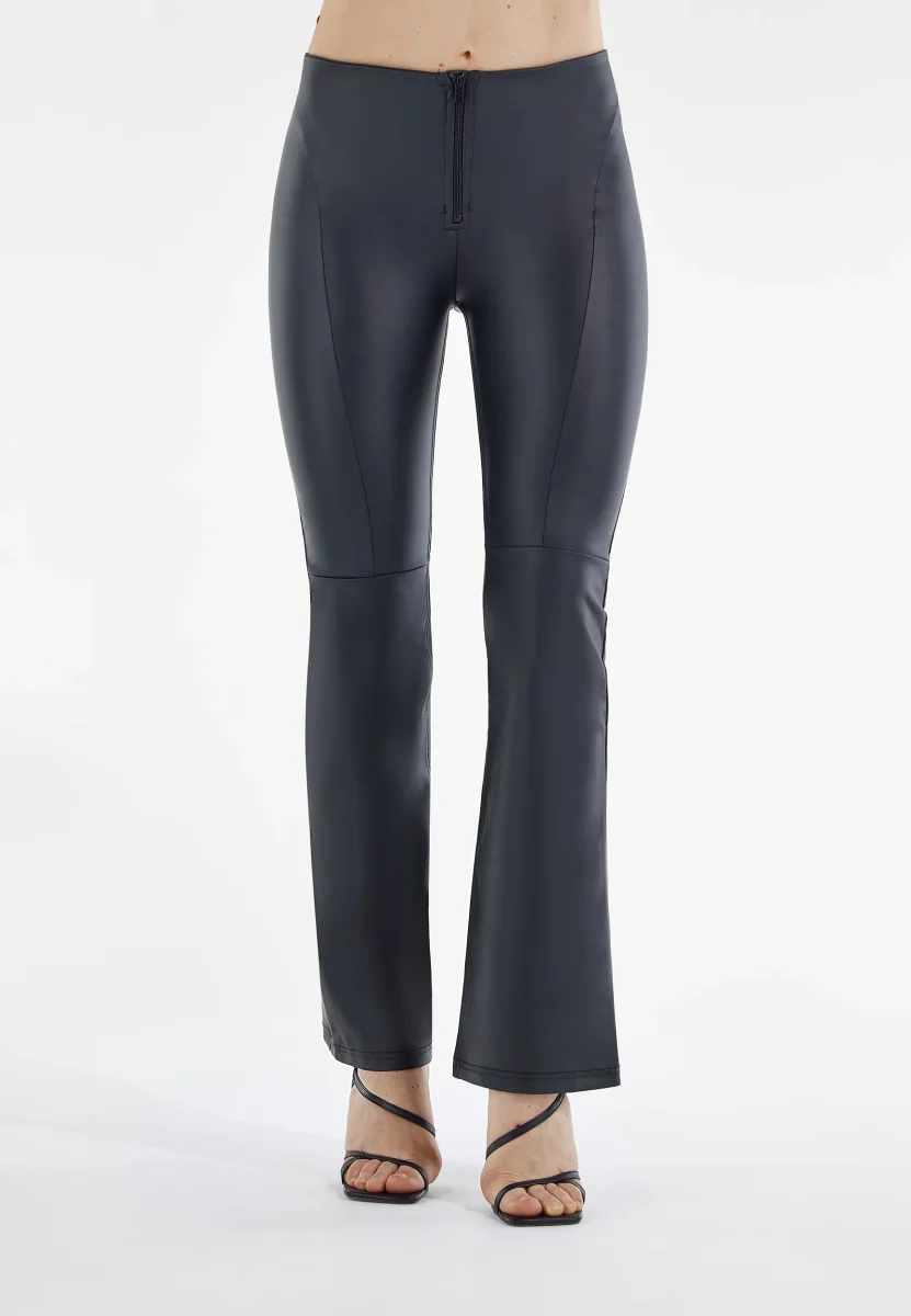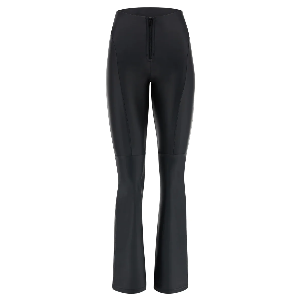 Pantaloni push up della linea WR.UP® in similpelle ecologica con vita alta sagomata leggermente a V e cuciture a blocchi. Hanno chiusura con zip frontale in tono, lunghezza regular e taglio flare che aderisce su vita e fianchi aprendosi a zampa verso il fondo. Capo dall’animo green ideato per valorizzare le forme grazie alla flessibilità del tessuto realizzato con poliestere a basso impatto ambientale ottenuto da bottiglie di plastica riciclate e all’effetto modellante e sollevante dato dalla tecnologia WR.UP® brevettata da Freddy che esalta la silhouette per mezzo di un particolare sistema di inserti e cuciture.