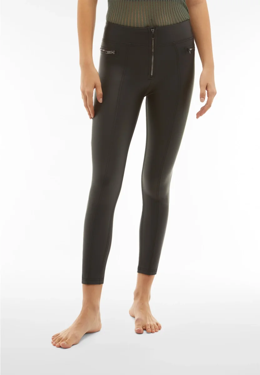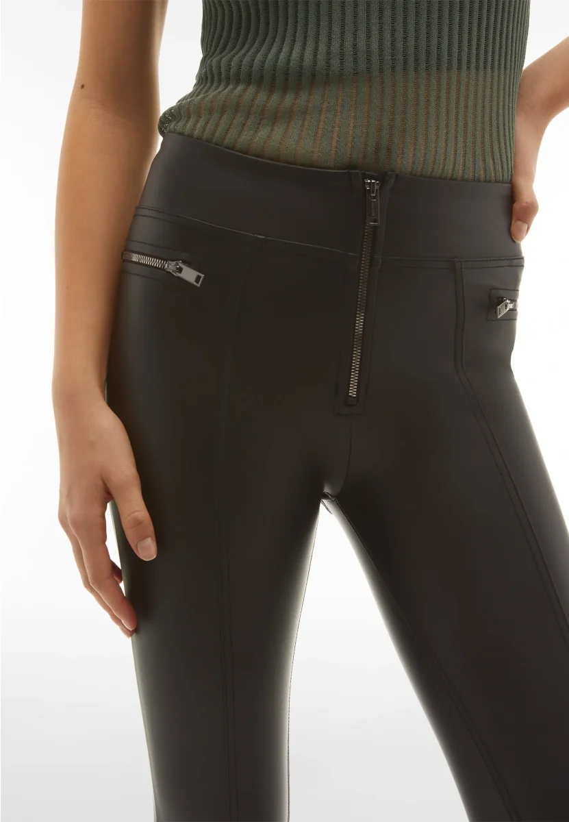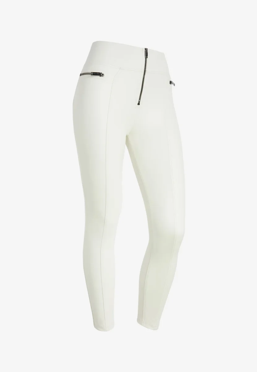 Questi pantaloni push up della linea WR.UP® hanno vita alta, zip decorative sui fianchi e vestibilità superskinny evidenziata dall’impuntura centrale sulle lunghezze. Uno stile ricercato dato anche dal tessuto in similpelle ecologica con superficie dall’effetto martellato, prodotto con poliestere a basso impatto ambientale ottenuto da bottiglie di plastica trasformate in nuova fibra.